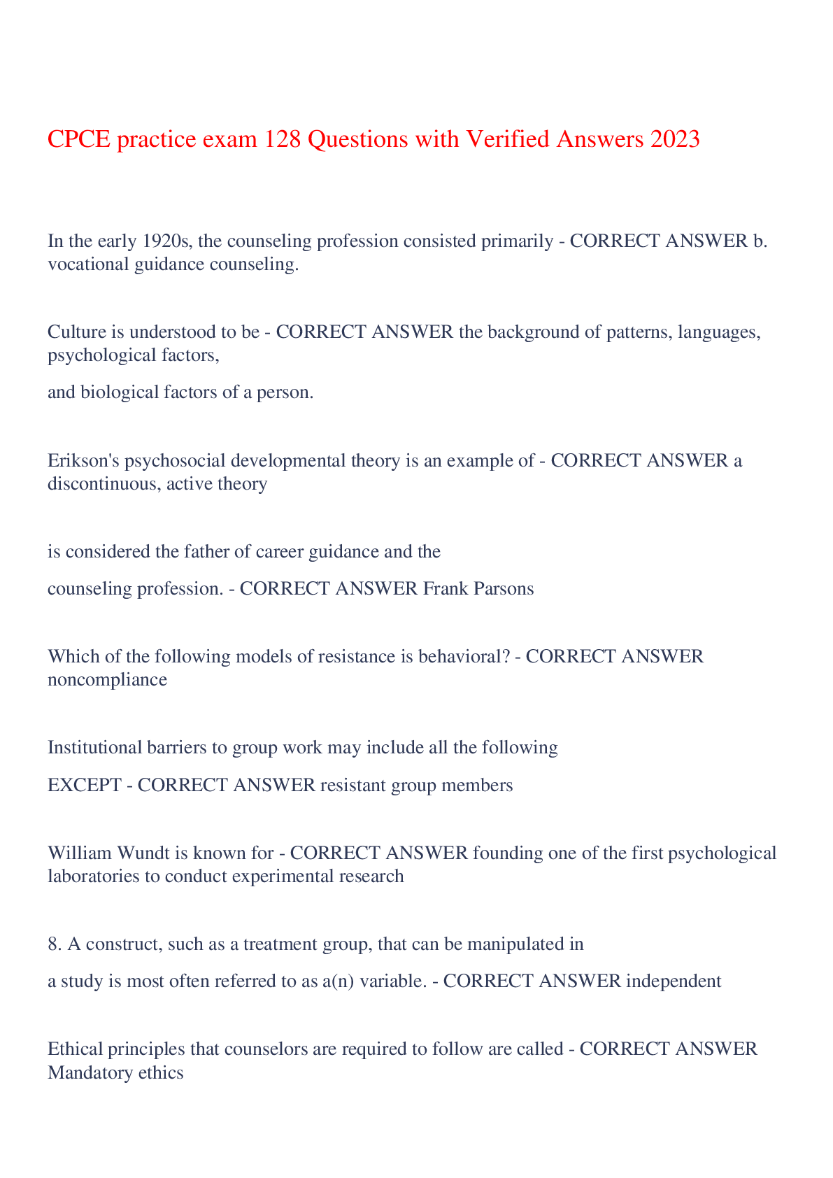 Health Care > EXAMs > CPCE Test A Practice Exam 135 Questions with Verified Answer 2023,100% CORRECT (All)