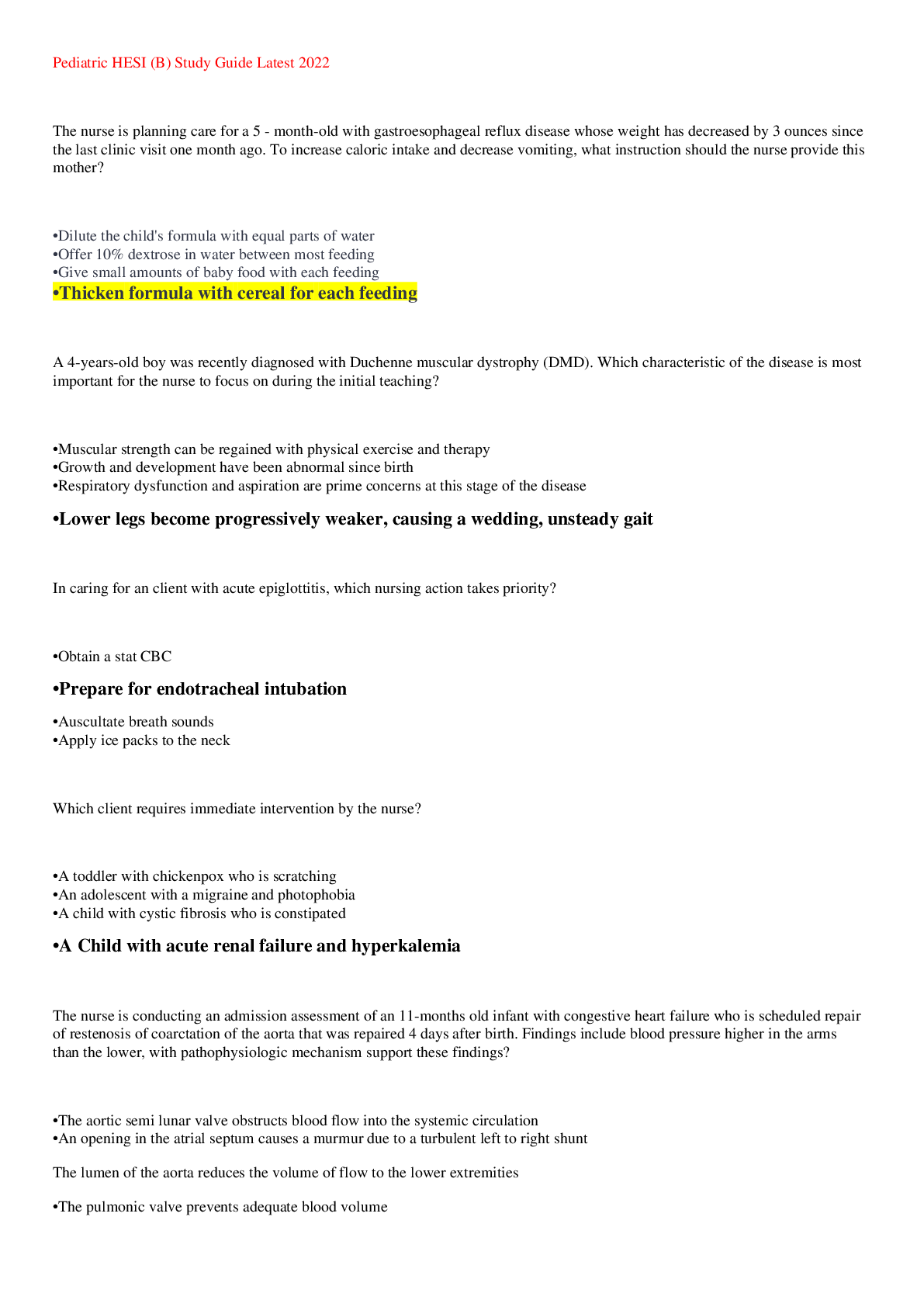 Health Care > STUDY GUIDE > Pediatric HESI (B) Study Guide Latest 2022 / 100 Correct Questions & Answers (All)