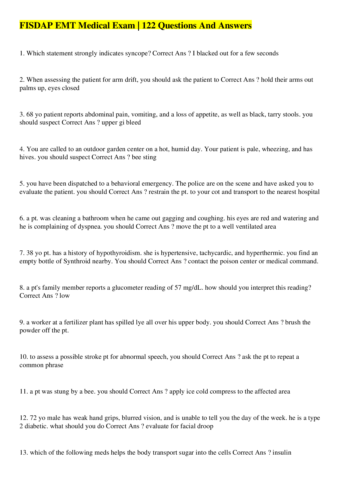 Health Care > FISDAP > FISDAP EMT Medical Exam | 122 Questions And Answers (All)