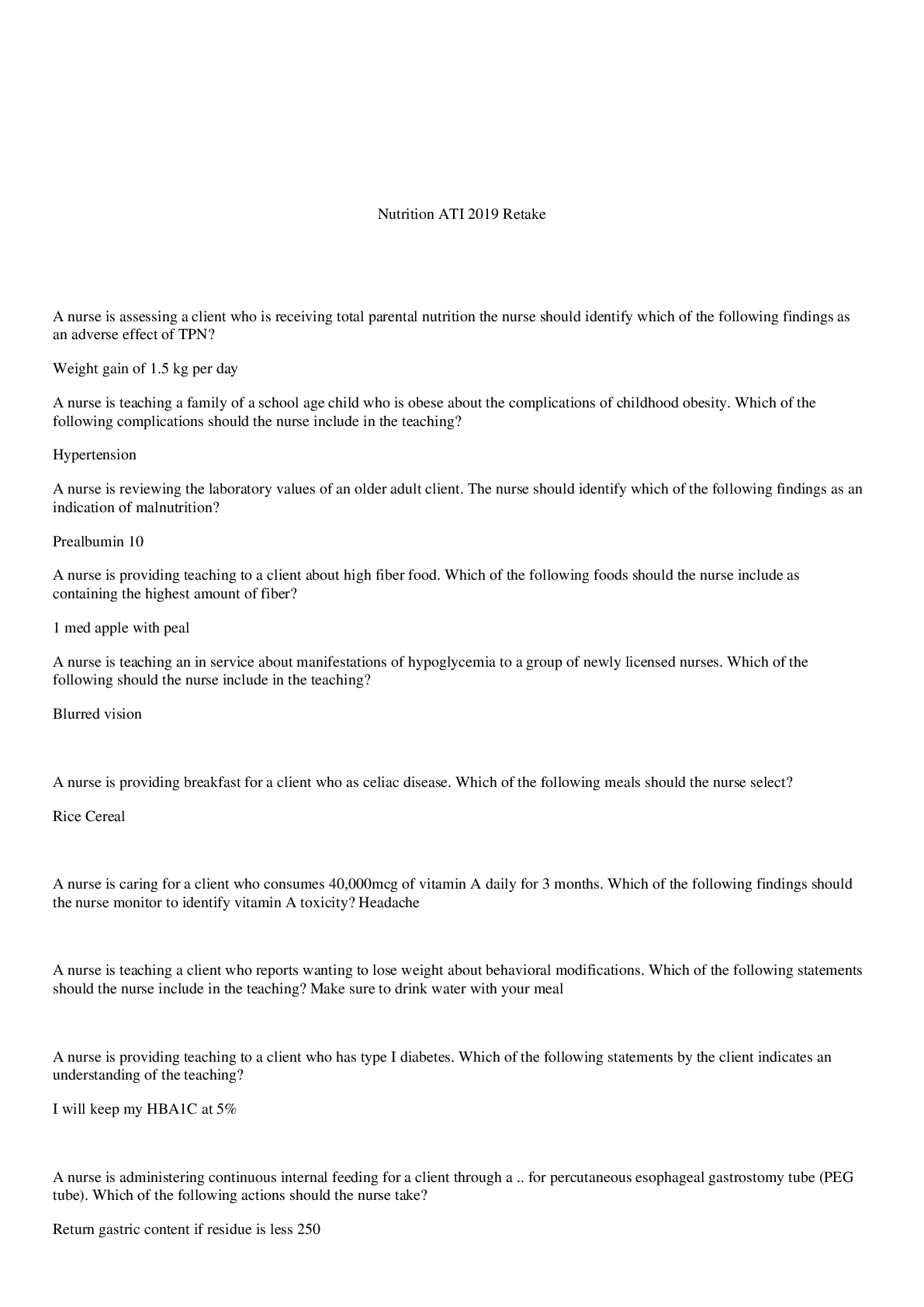 Health Care > STUDY GUIDE > ATI NUTRITION PROCTORED 2019 RETAKE GUIDE- Correct Questions & Answers (All)