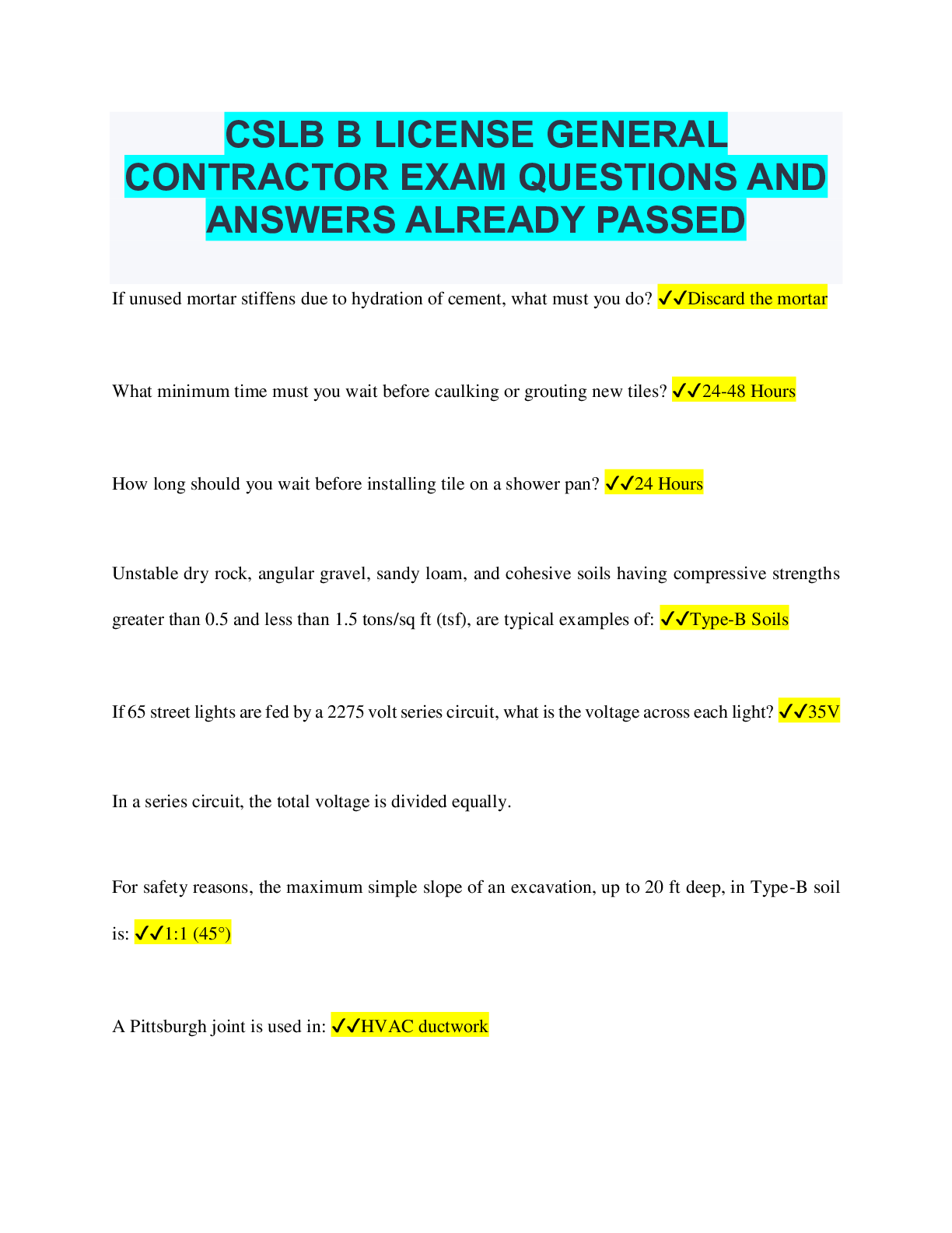 Construction and The Built Environment > QUESTIONS & ANSWERS > CSLB B LICENSE GENERAL CONTRACTOR EXAM QUESTIONS AND ANSWERS ALREADY PASSED (All)