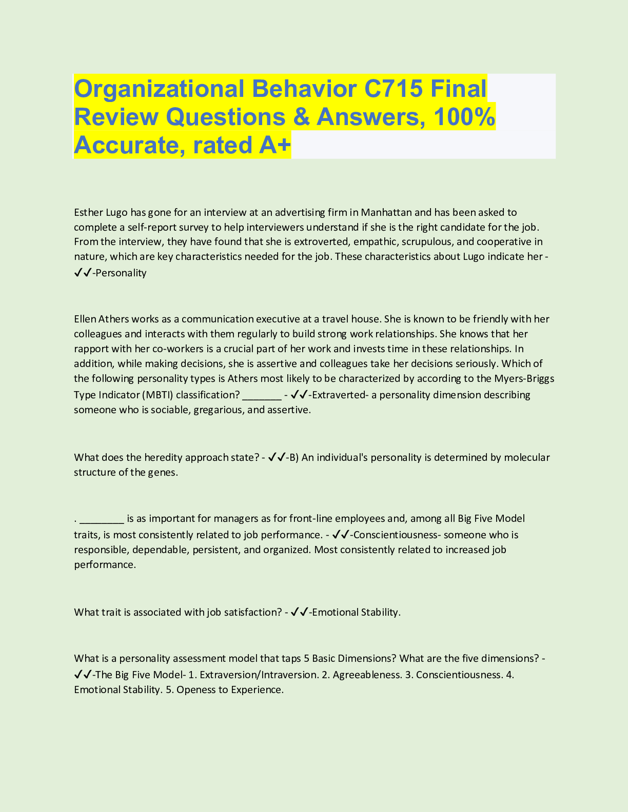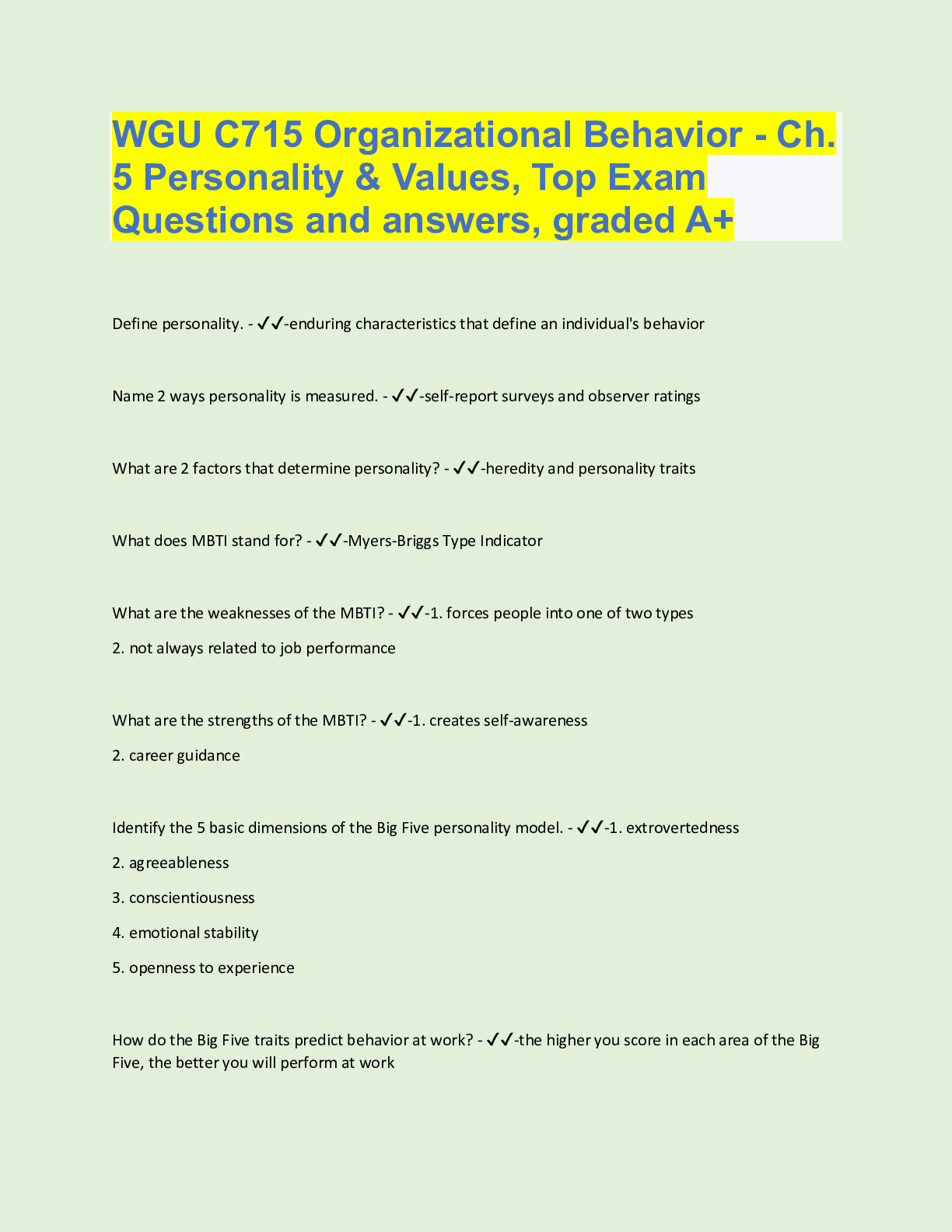 Organizational Behavior > QUESTIONS & ANSWERS > WGU C715 Organizational Behavior - Ch. 5 Personality & Values, Top Exam Questions and answers, graded A+ (All)