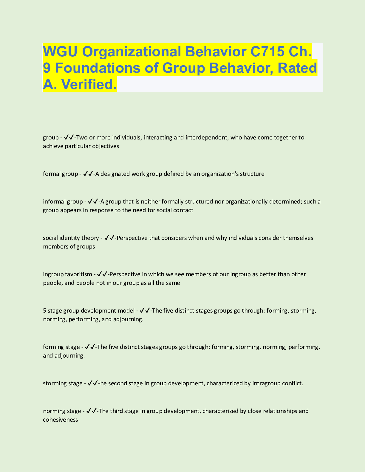 Organizational Behavior > QUESTIONS & ANSWERS > WGU Organizational Behavior C715 Ch. 9 Foundations of Group Behavior, Rated A. Verified. (All)