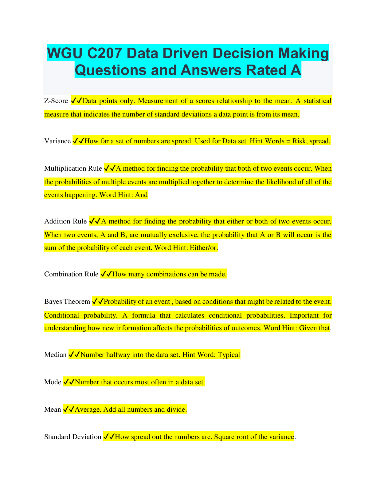 DATA ANALYSIS FOR BUSINESS APPLICATIONS > QUESTIONS & ANSWERS > WGU C207 Data Driven Decision Making Questions and Answers Rated A (All)