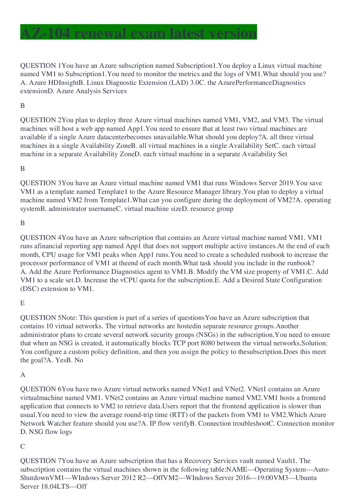 DATA ANALYSIS > QUESTIONS & ANSWERS > AZ-104 renewal exam latest version (All)