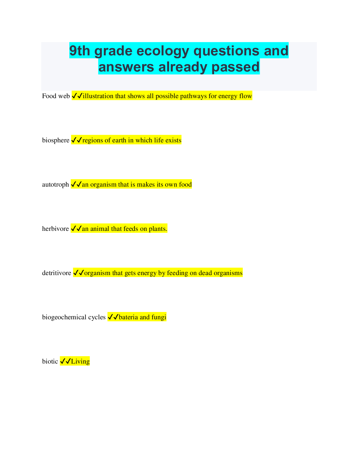 Ecology > QUESTIONS & ANSWERS > 9th grade ecology questions and answers already passed (All)