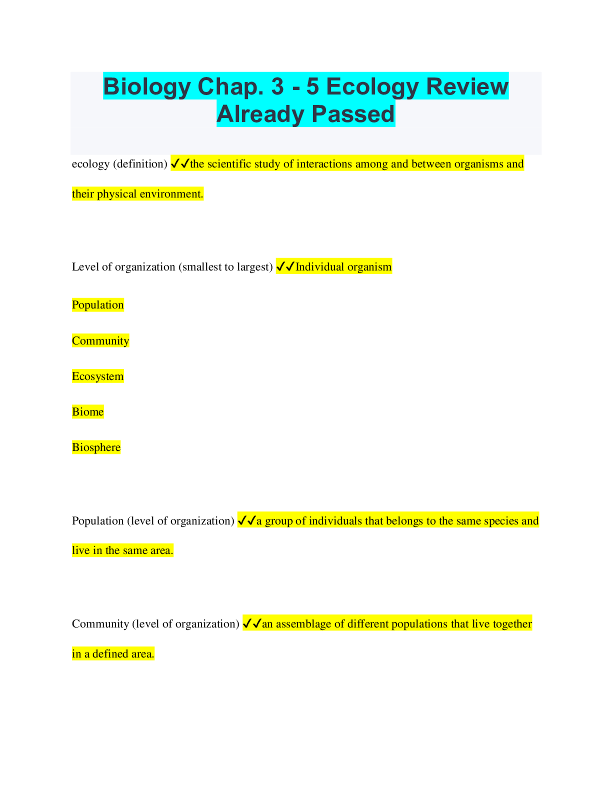 Ecology > QUESTIONS & ANSWERS > Biology Chap. 3 - 5 Ecology Review Already Passed (All)