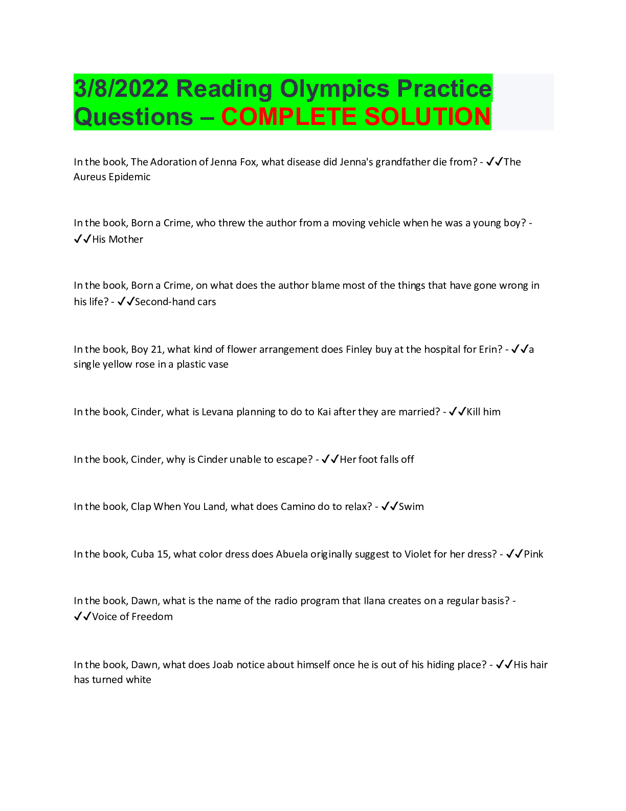 Literary Studies > QUESTIONS & ANSWERS > 3/8/2022 Reading Olympics Practice Questions – COMPLETE SOLUTION (All)