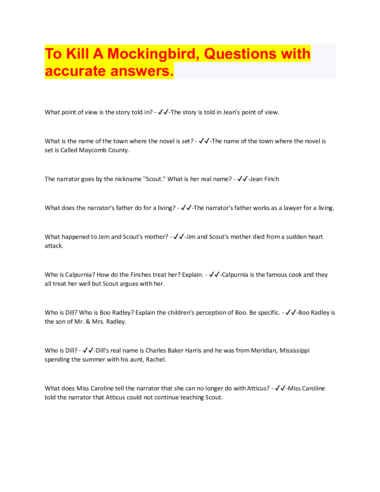 Literary Studies > QUESTIONS & ANSWERS > To Kill A Mockingbird, Questions with accurate answers. (All)