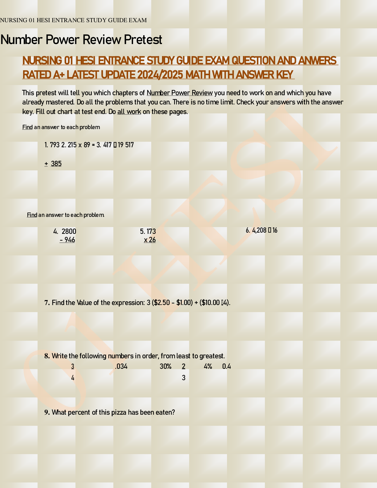 Mathematics > EXAM > NURSING 01 HESI ENTRANCE STUDY GUIDE EXAM QUESTION AND ANWERS RATED A+ LATEST UPDATE 2024/2025 MATH WITH ANSWER KEY (All)