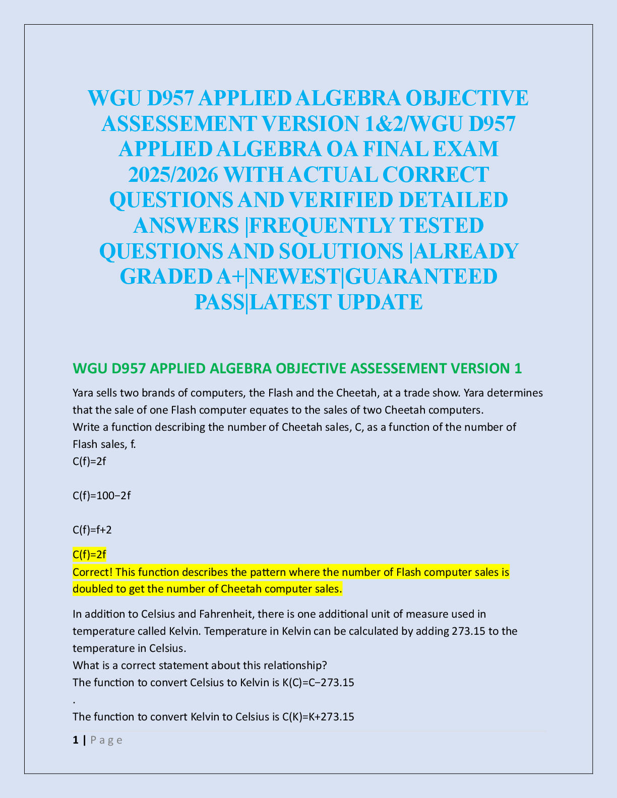 Mathematics > EXAM > WGU D957 APPLIED ALGEBRA OBJECTIVE ASSESSEMENT VERSION 1&2 (All)