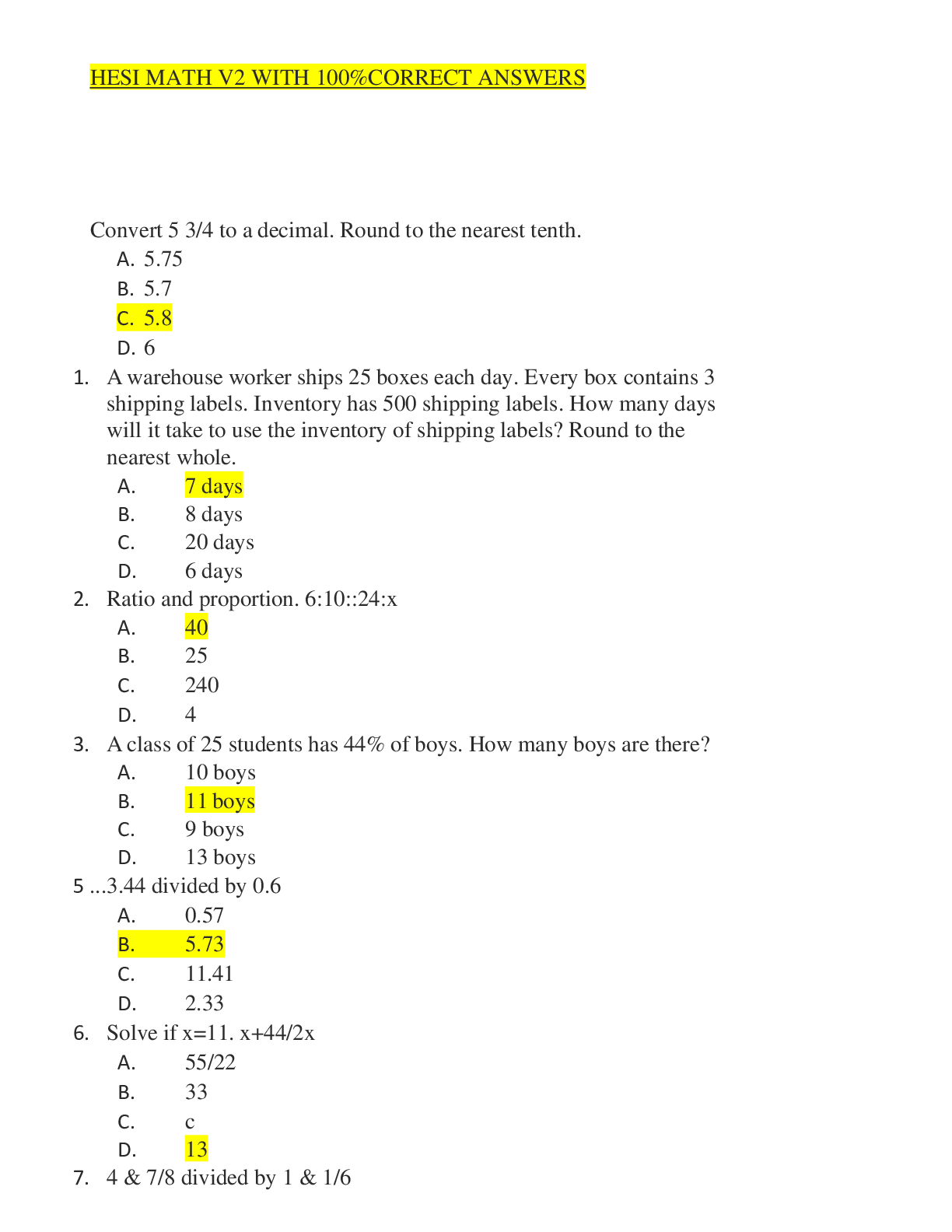 Mathematics > EXAM > HESI MATH V2 WITH 100%CORRECT ANSWERS (All)