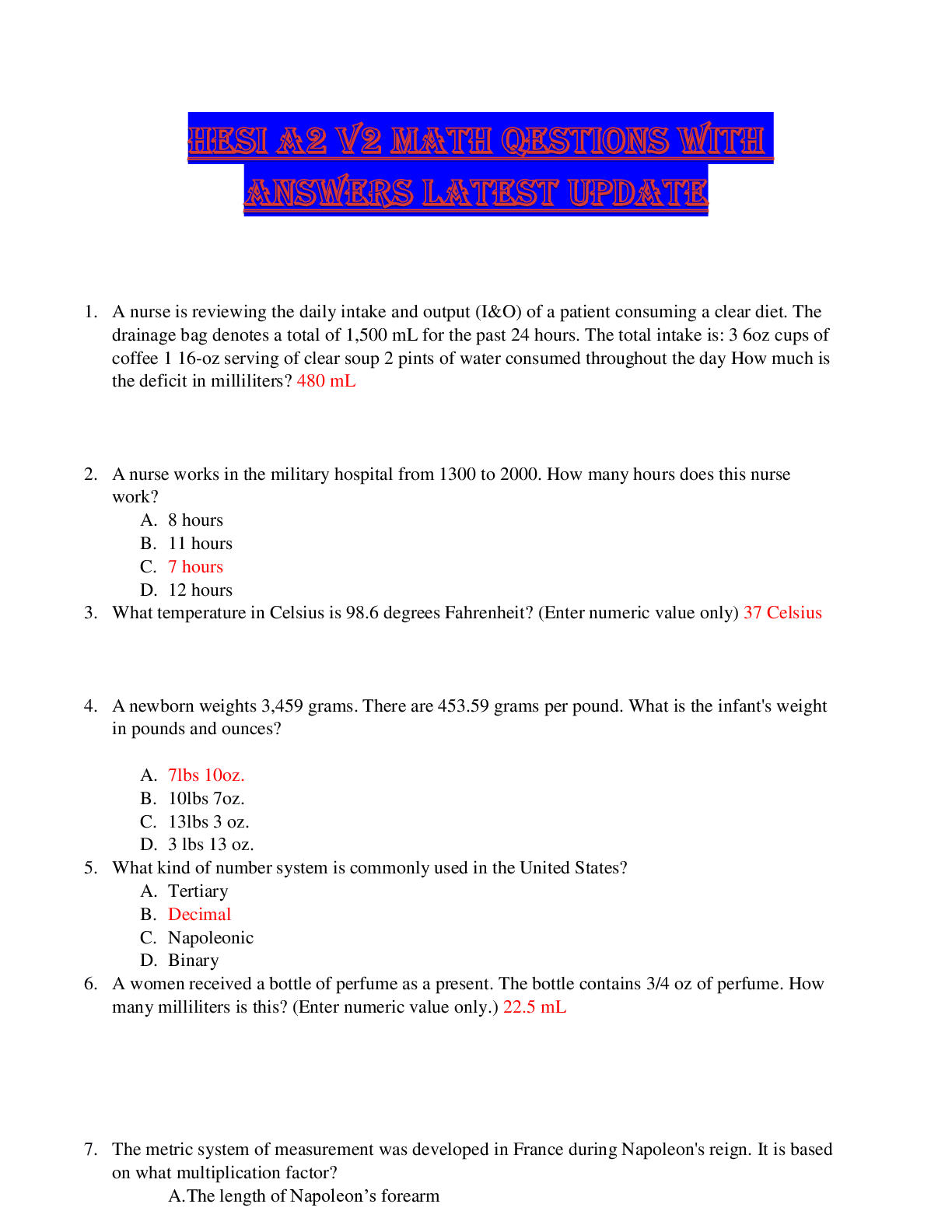 Mathematics > EXAM > HESI A2 V2 MATH QESTIONS WITH ANSWERS LATEST UPDATE (All)