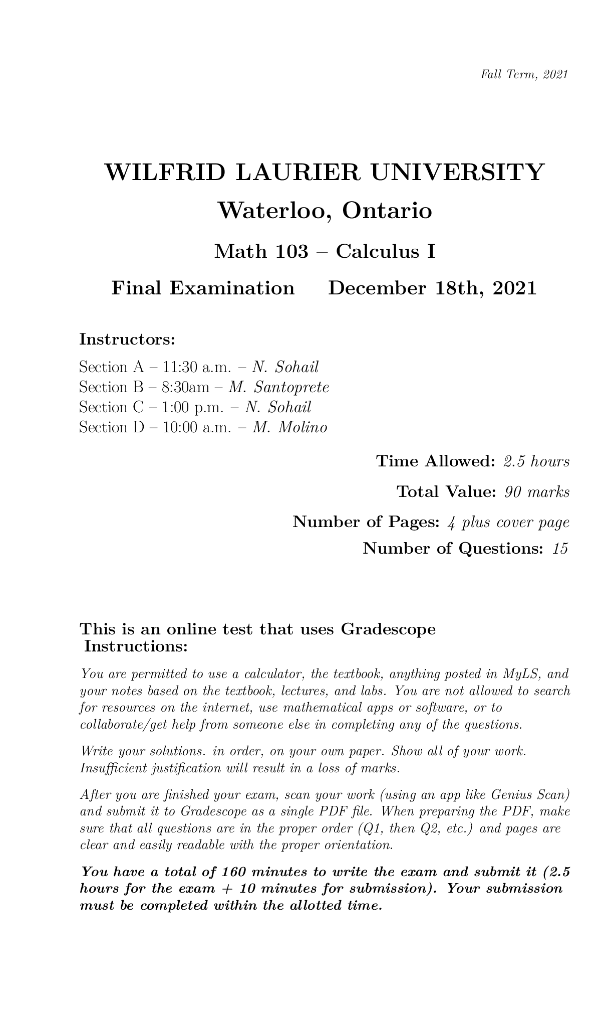 Mathematics > EXAM > WILFRID LAURIER UNIVERSITY Waterloo, Ontario Math 103 – Calculus I Final Examination December 18th, 2021 (All)