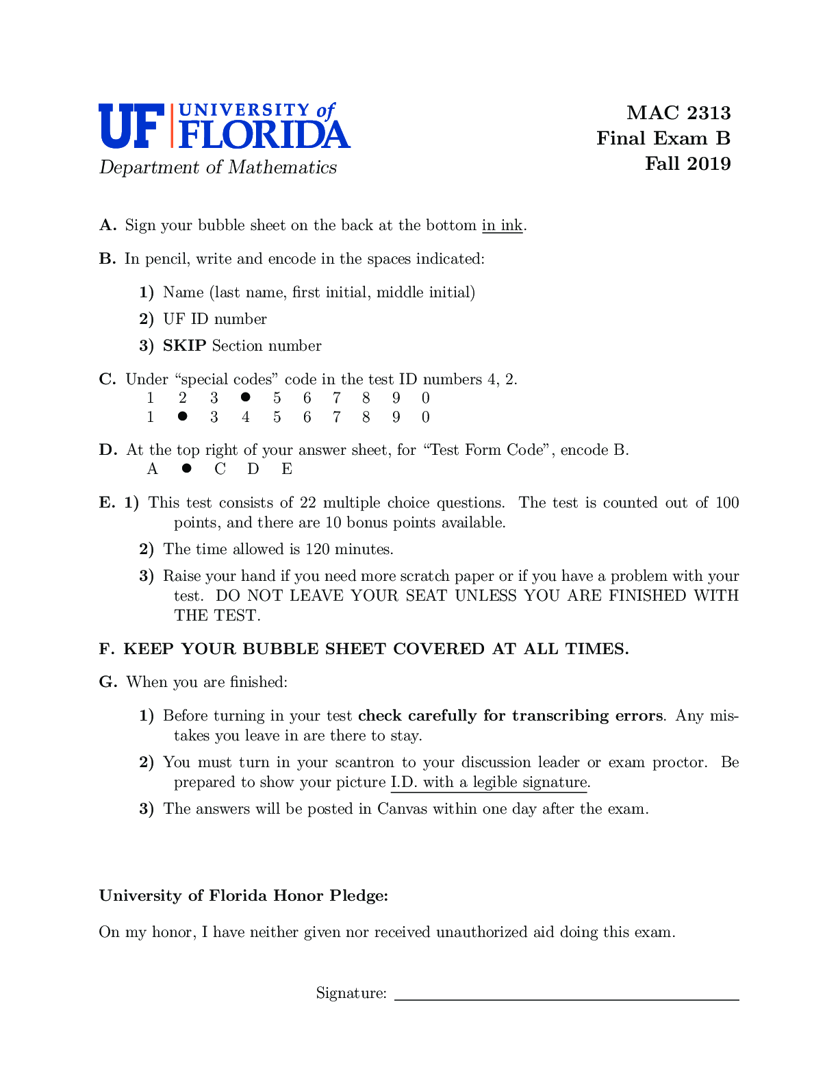 Mathematics > EXAM > MAC 2313 CALCULUS 3 - University of Florida. Final Exam B 2019. (All)
