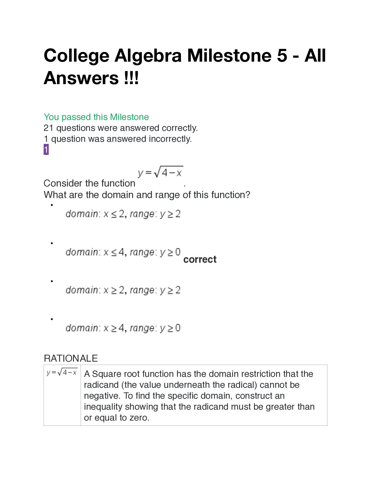 Mathematics > EXAM > Sophia Unit 5 Milestone 5 College Algebra with correct answers (All)