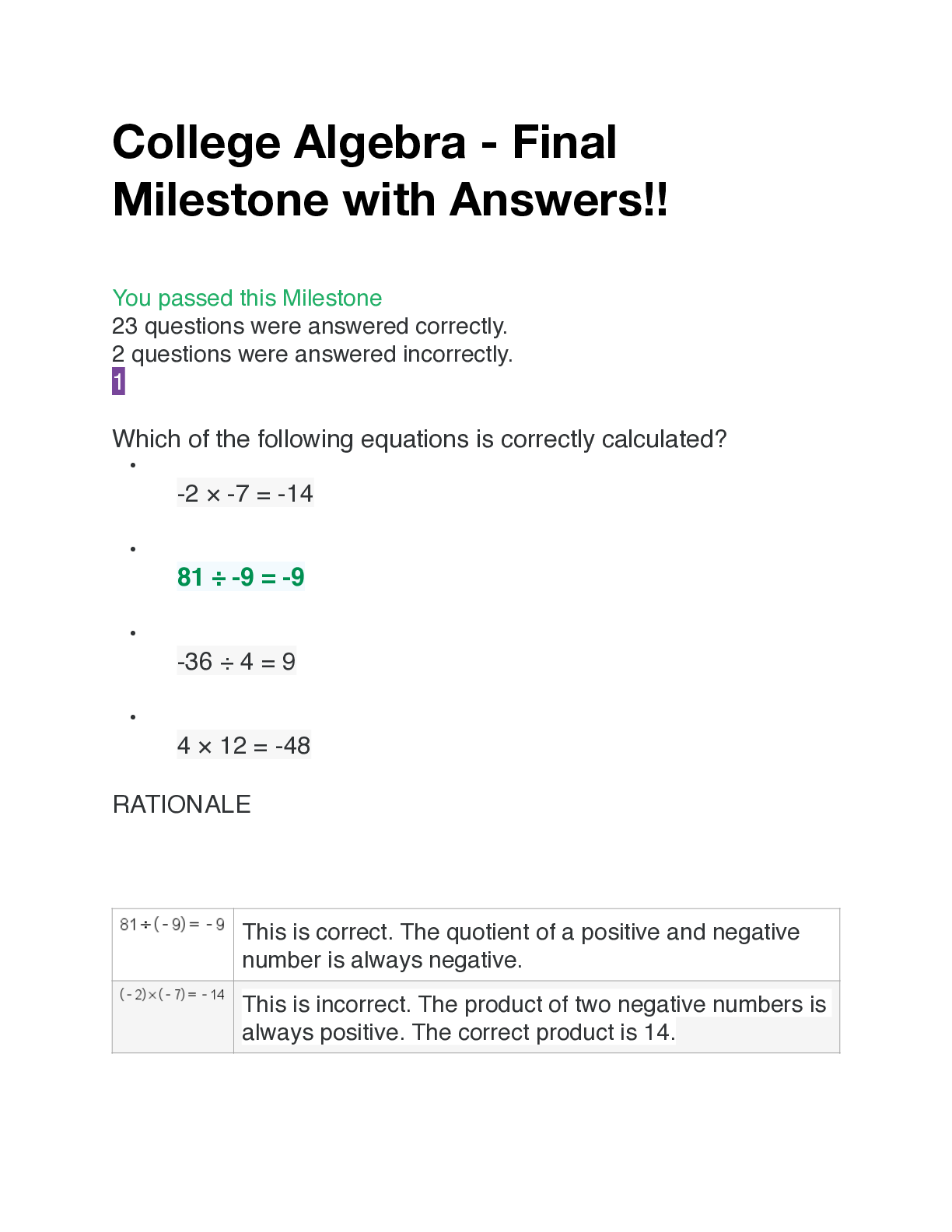 Mathematics > EXAM > Sophia Unit 1 Milestone 1 College Algebra with correct answers (All)