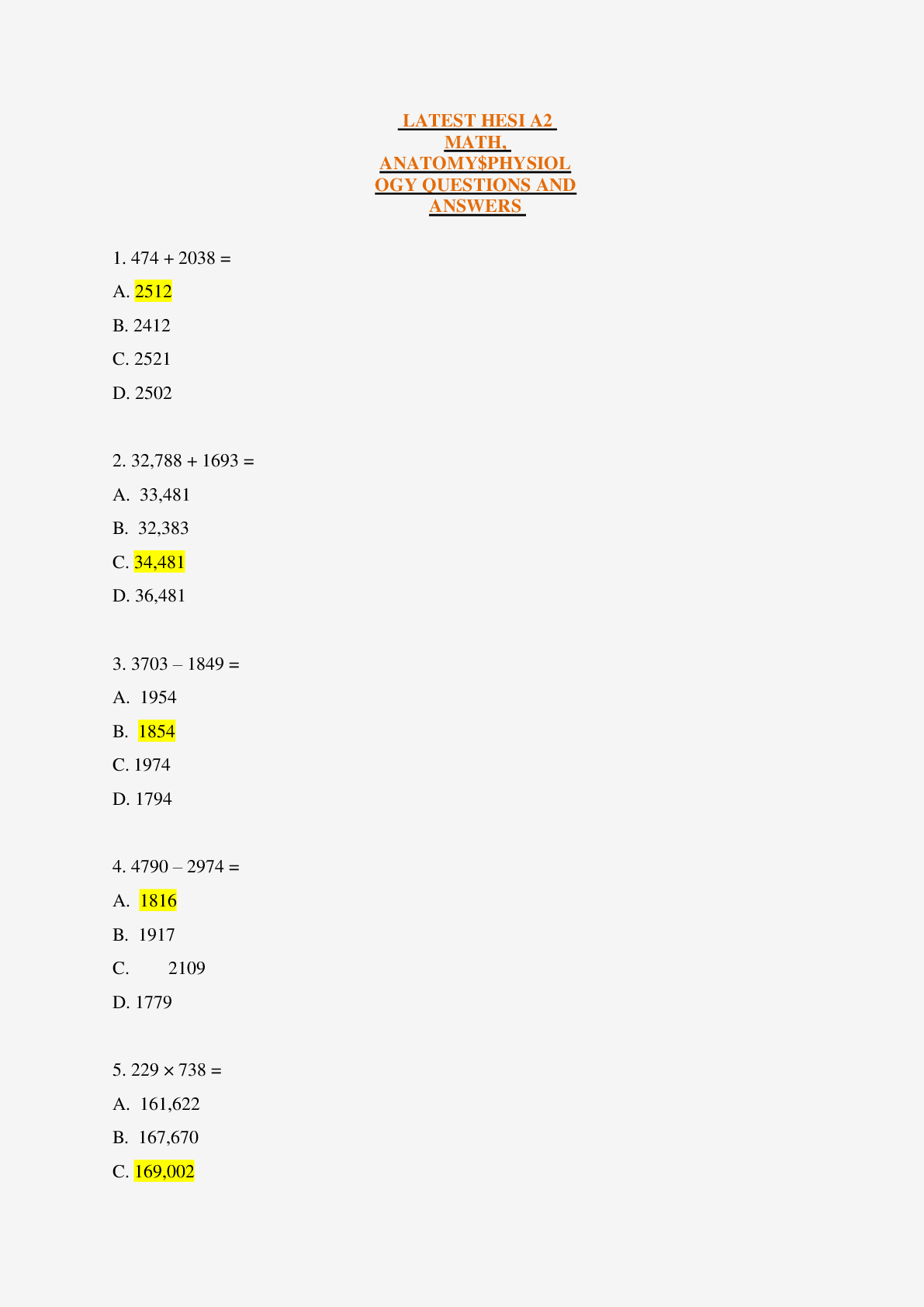 Mathematics > EXAM > LATEST HESI A2 MATH, ANATOMY$PHYSIOLOGY QUESTIONS AND ANSWERS (All)