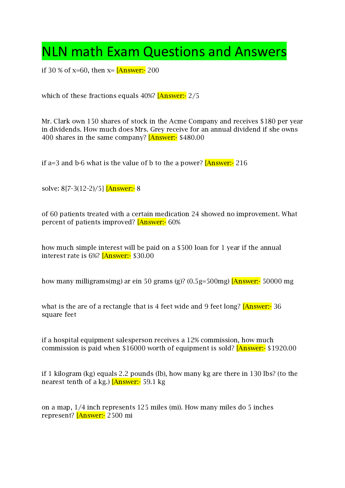 Mathematics > EXAM > NLN math Exam Questions and Answers 2023| Graded A (All)