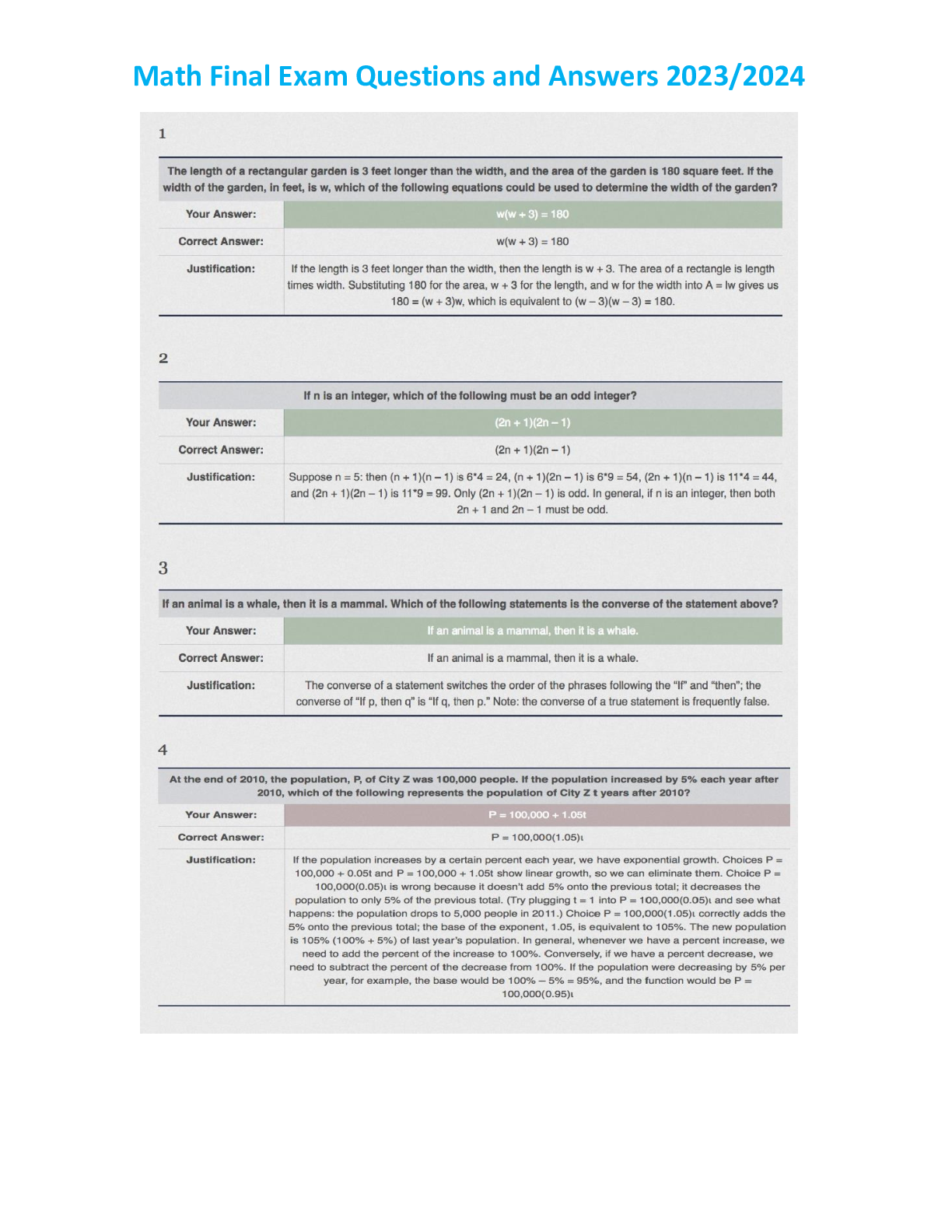 Mathematics > EXAM > Math Final Exam Questions and Answers 2023/2024 (All)