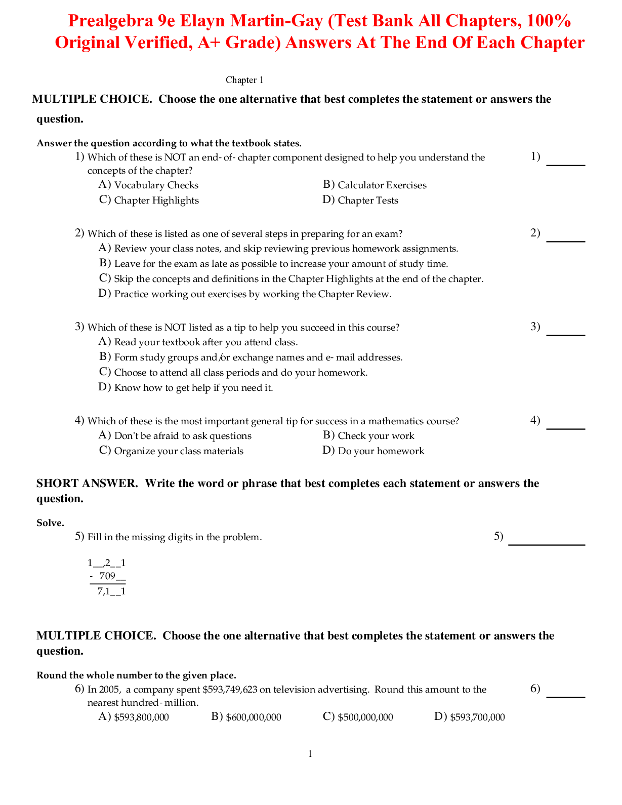 Mathematics > TEST BANKS > TEST BANK for Prealgebra 9e Elayn Martin-Gay.Answers At The End Of Each Chapter (All)