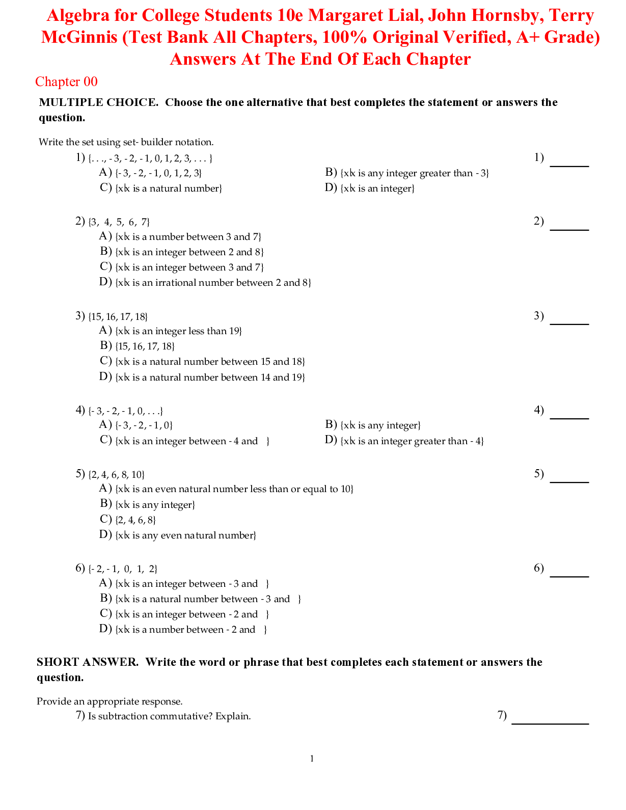 Mathematics > TEST BANKS > Test Bank For Algebra for College Students 9th Edition By Margaret Lial, John Hornsby, Terry McGinnis | All Chapters 1-17 (All)