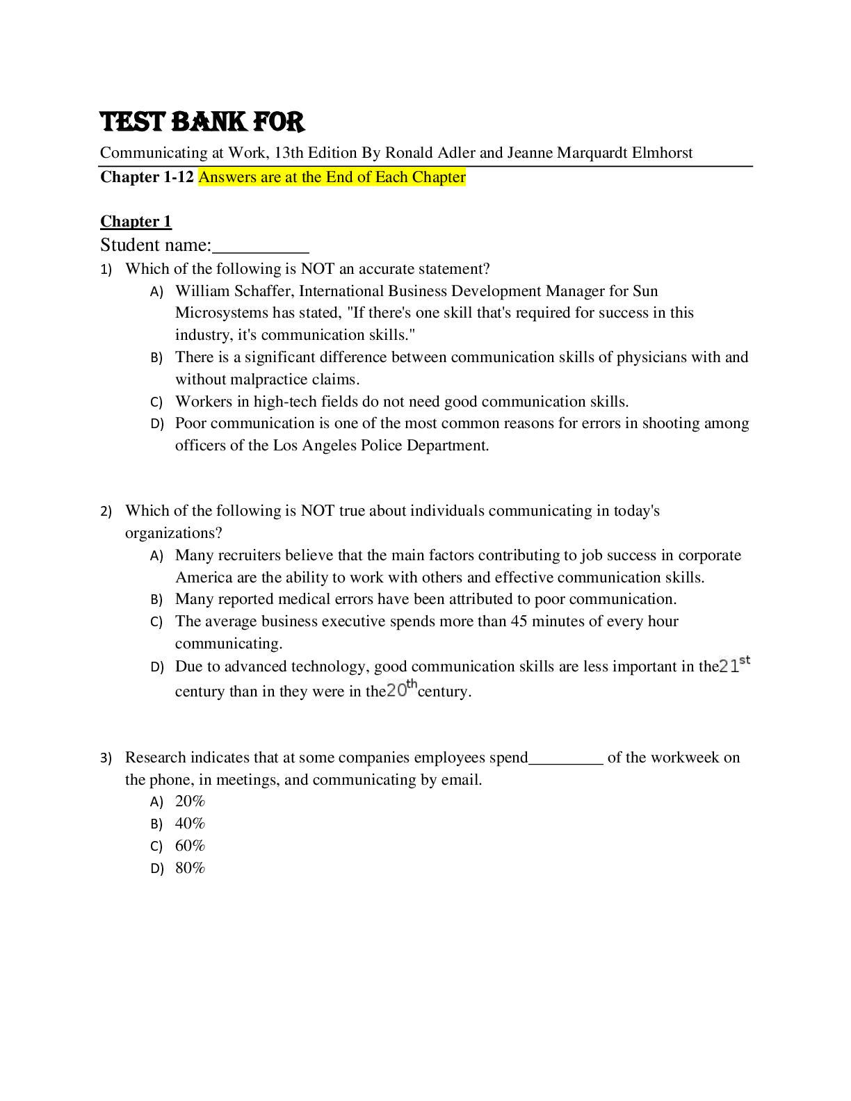Mathematics > TEST BANKS > Test Bank For Communicating at Work, 13rd Edition By Ronald Adler and Jeanne Marquardt Elmhorst Chapter 1-12 (All)