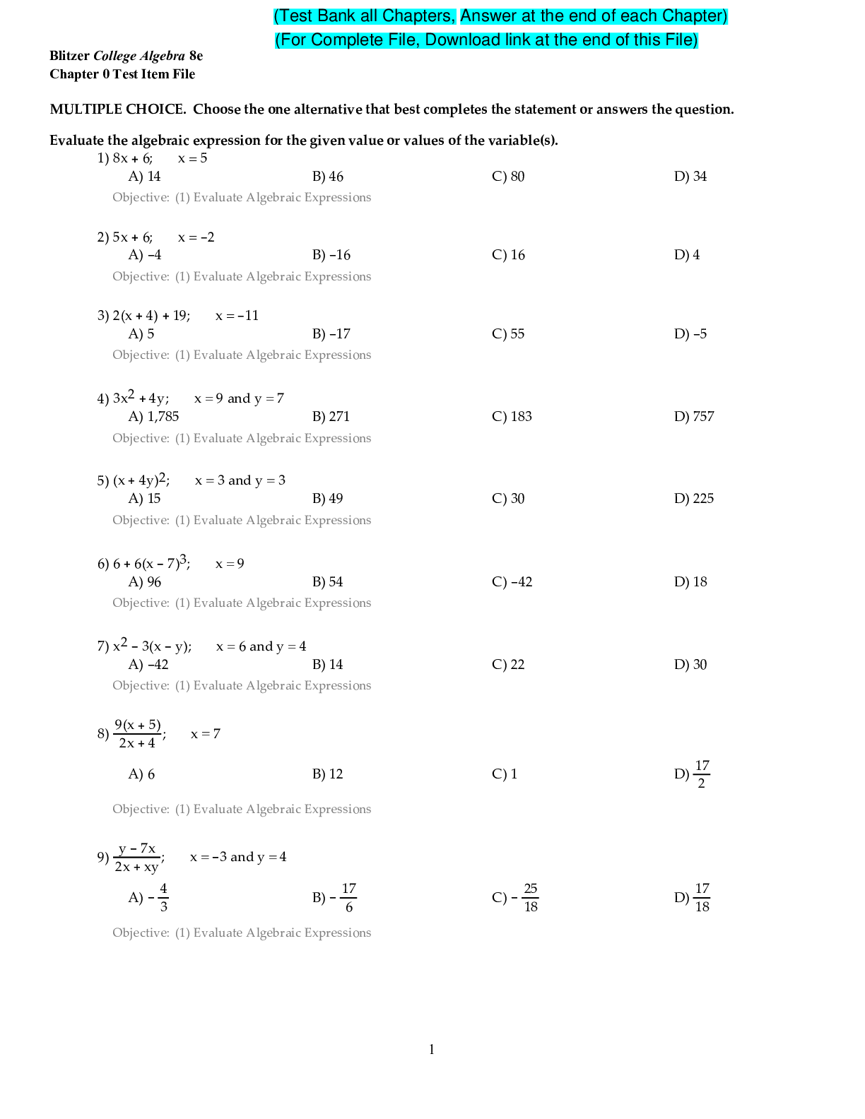 Mathematics > TEST BANKS > College Algebra, 8e Robert Blitzer (Test Bank) (All)
