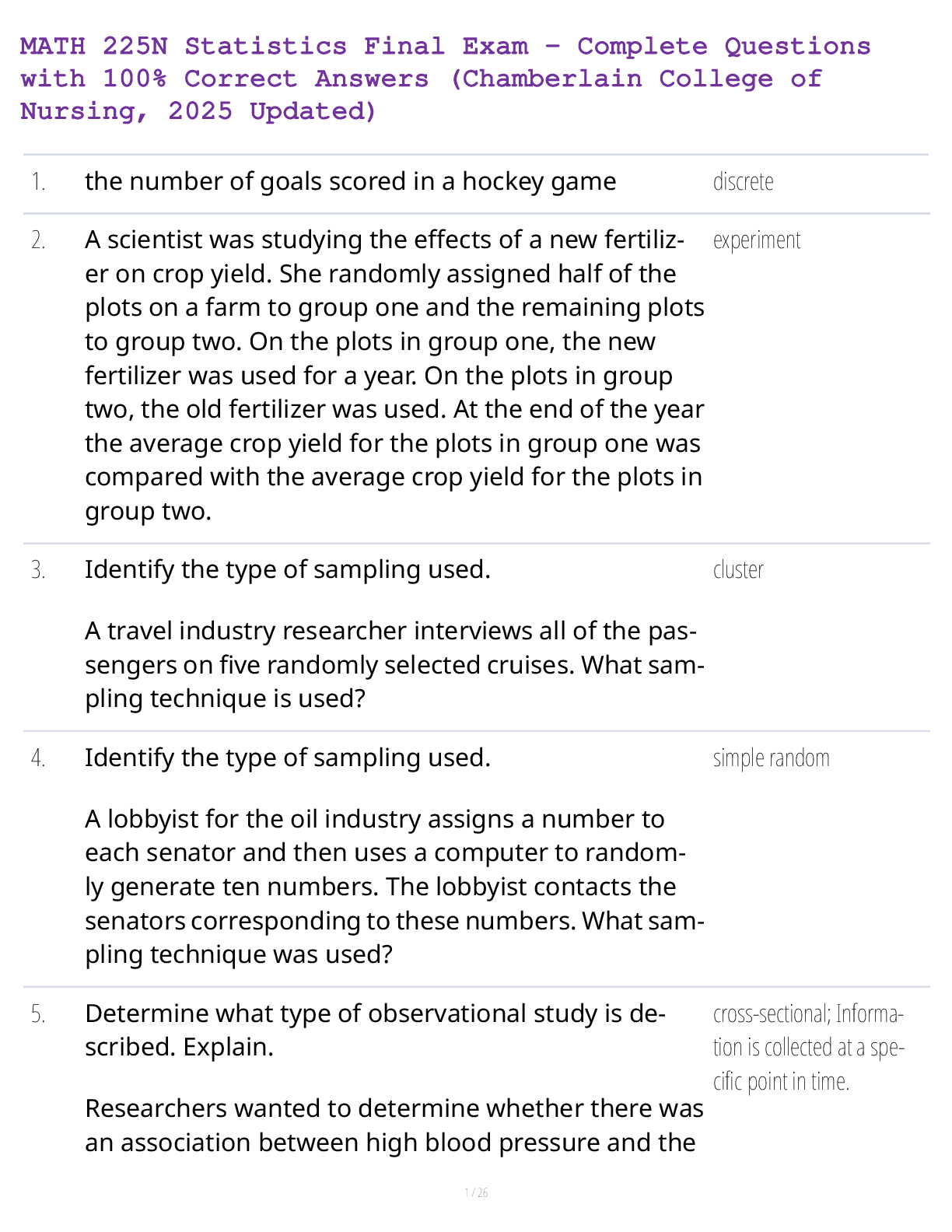 Mathematics > QUESTIONS and ANSWERS > MATH 225N Statistics Final Exam – Complete Questions with 100% Correct Answers (Chamberlain College of Nursing, 2025 Updated) (All)