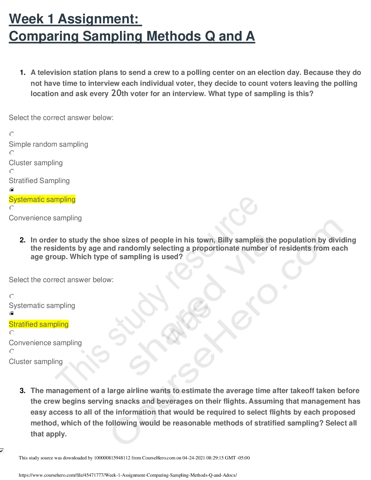 Mathematics > QUESTIONS & ANSWERS > Week 1 Assignment Comparing Sampling Methods Q and A (All)