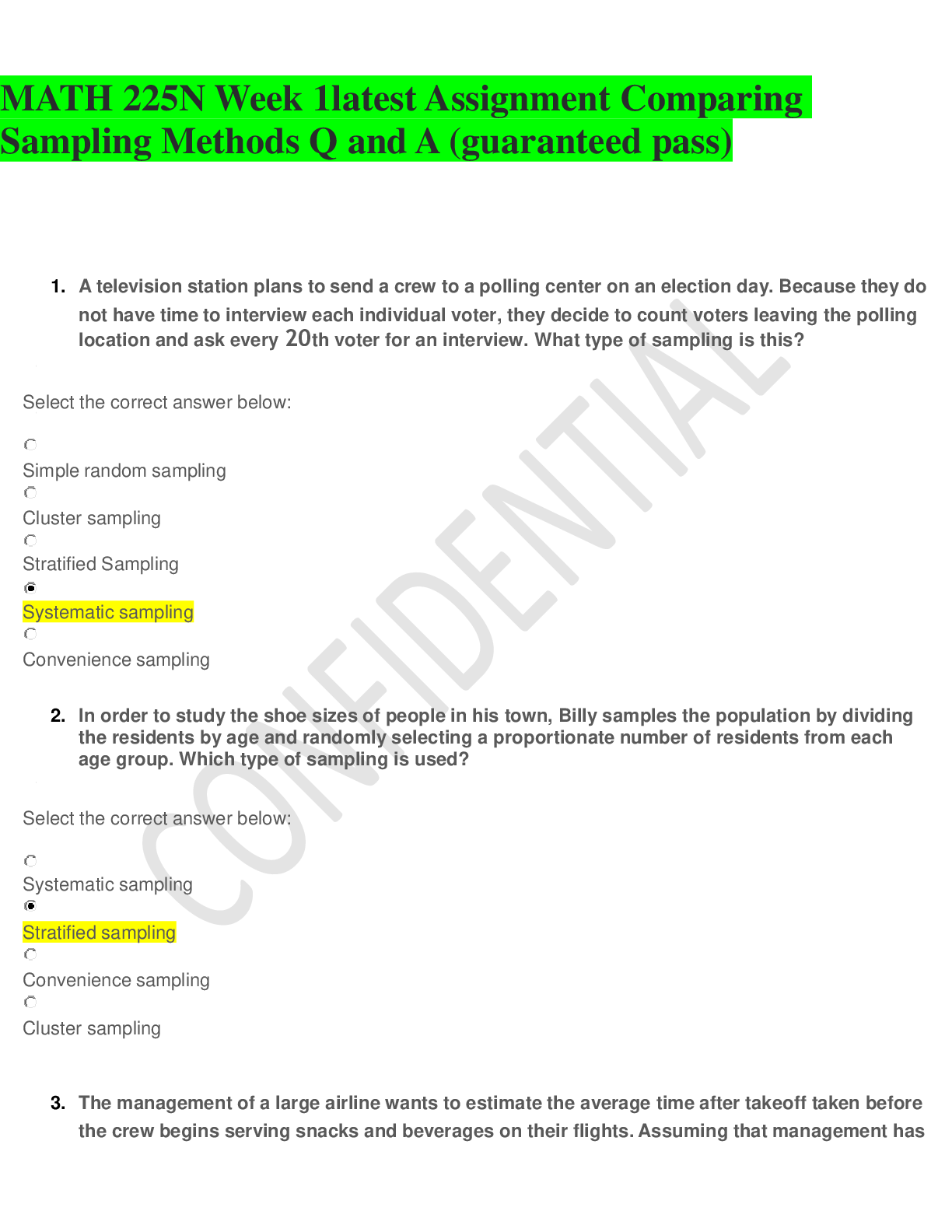 Mathematics > QUESTIONS & ANSWERS > MATH 225N Week 1 Assignment Sampling Methods – Questions and Answers (All)