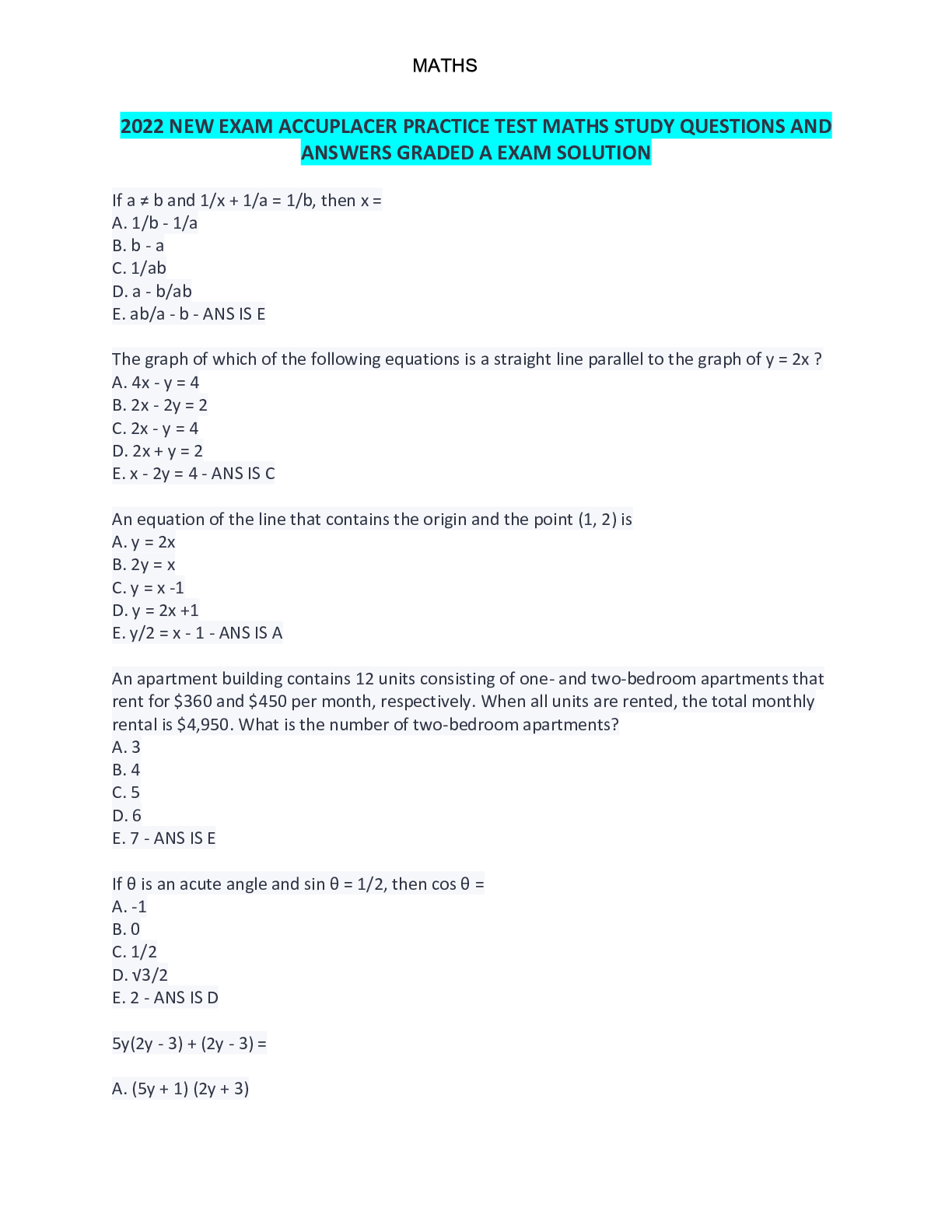 Mathematics > QUESTIONS & ANSWERS > 2022 NEW EXAM ACCUPLACER PRACTICE TEST MATHS STUDY QUESTIONS AND ANSWERS GRADED A EXAM SOLUTION (All)