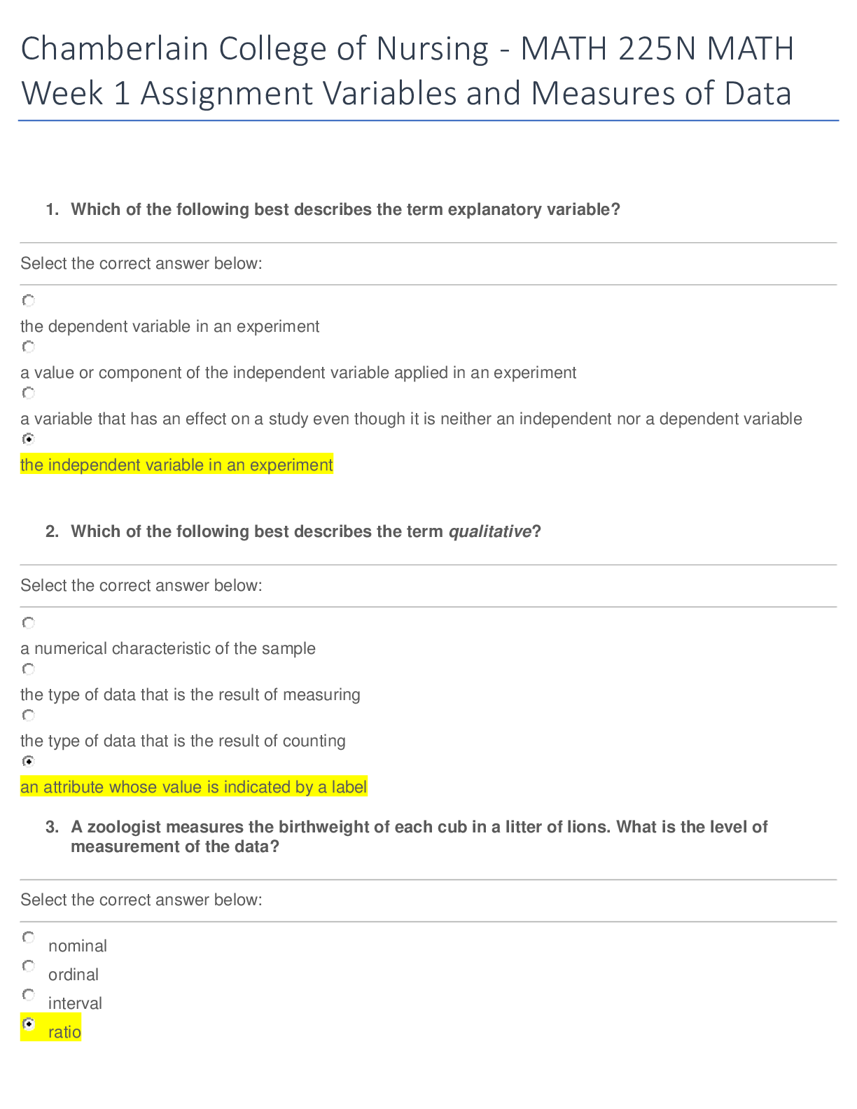 Mathematics > QUESTIONS & ANSWERS > MATH225N Week 1 Assignment: Variables and Measures of Data: Chamberlain College of Nursing Graded A) (All)