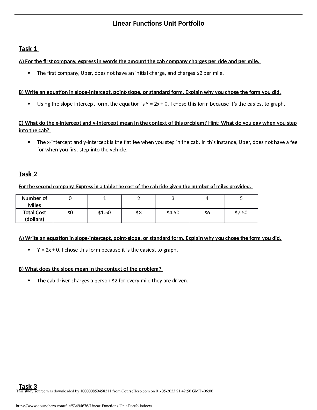 Mathematics > QUESTIONS & ANSWERS > Questions & Answers > Linear Functions Unit Portfolio Connections - High School Level MATH 10013104. Q&A. (All)