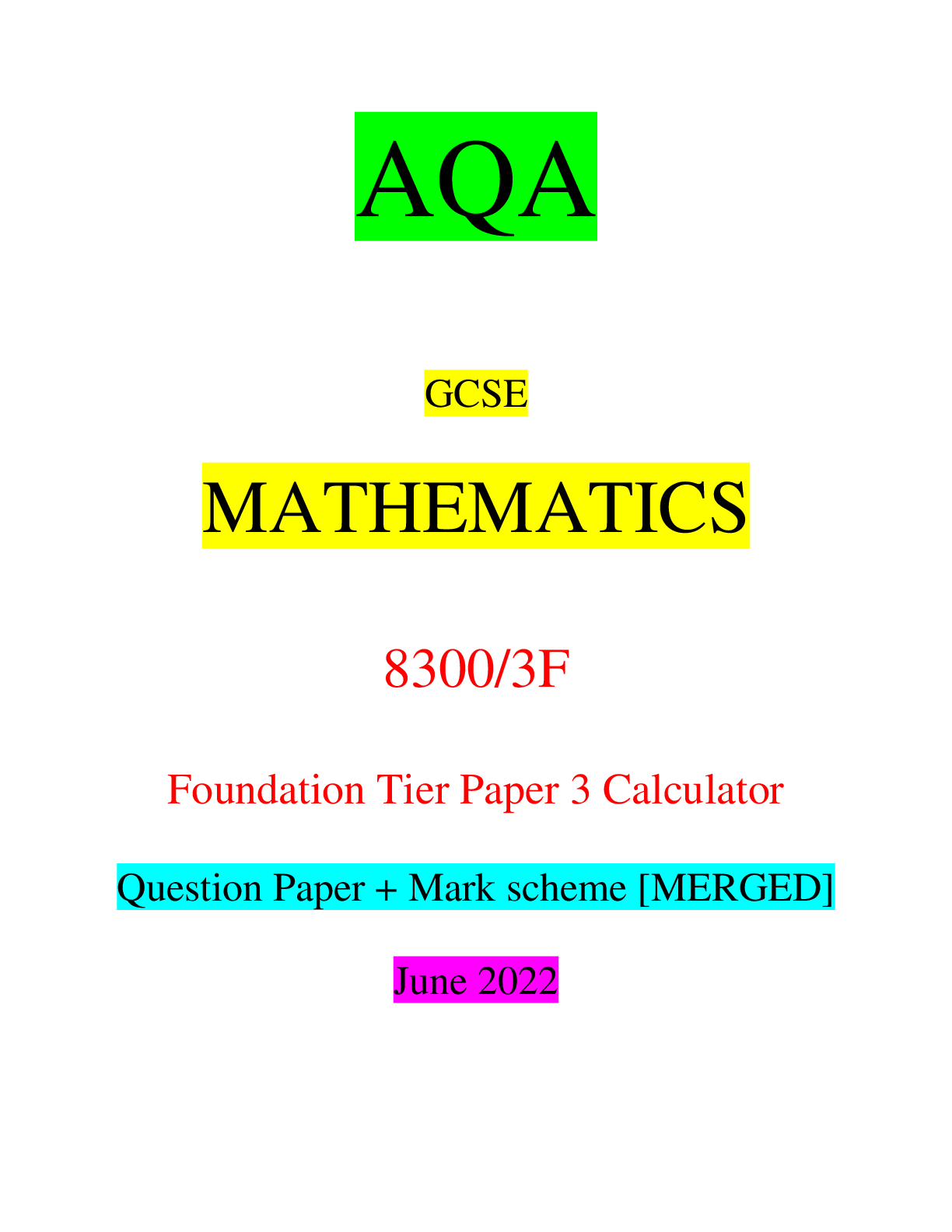 Mathematics > AQA QUESTION and MARK SCHEMES > AQA GCSE MATHEMATICS 8300/3F Foundation Tier Paper 3 Calculator Question Paper + Mark scheme [MERGED] June 2022 (All)