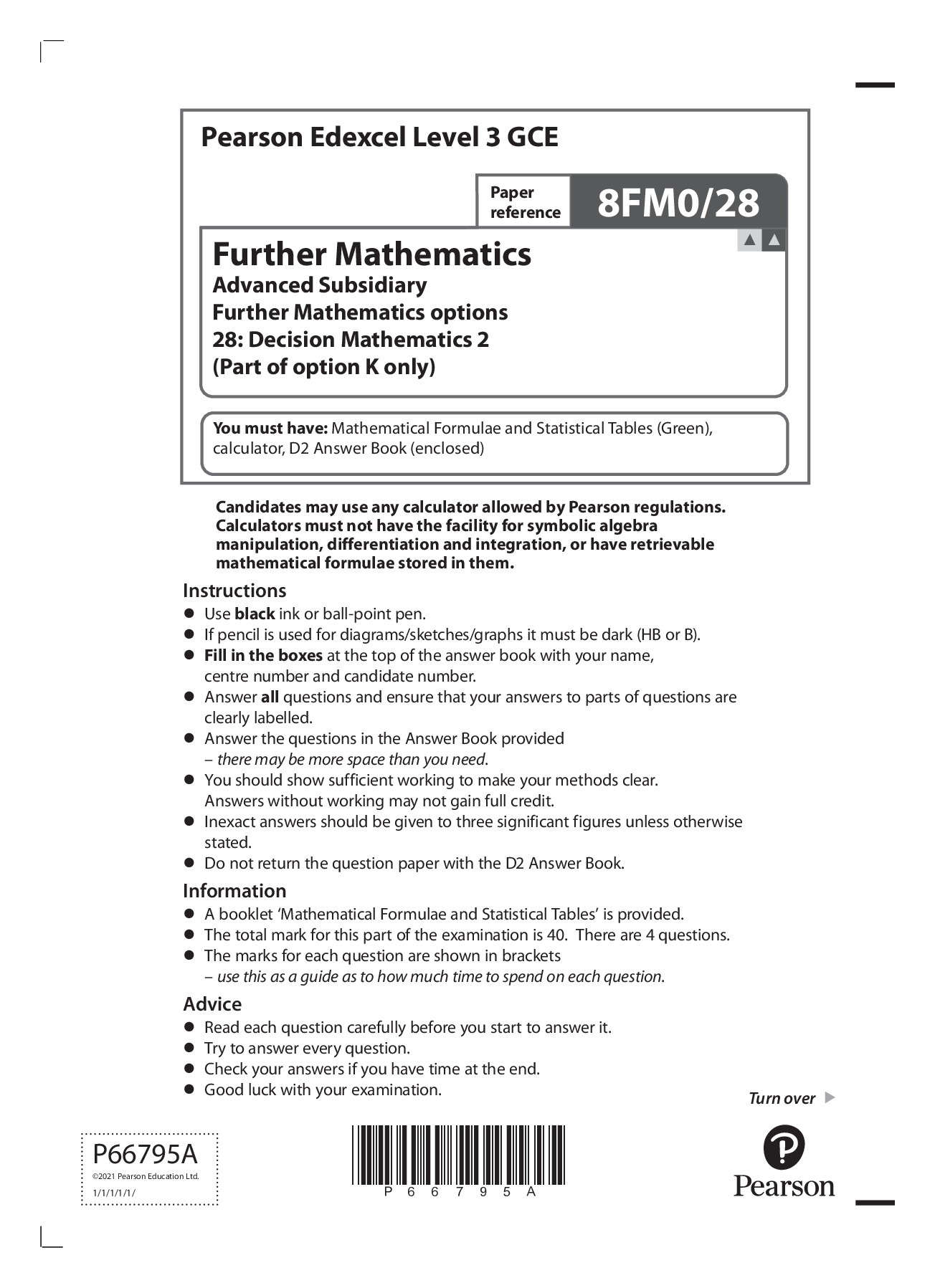 Mathematics > QUESTION PAPER & MARK SCHEME > Pearson Edexcel Level 3 GCE, Further Mathematics Advanced Subsidiary Further Mathematics options 28: Decision Mathematics 2 (Part of option K only) question booklet and mark scheme results November 2021 (All)