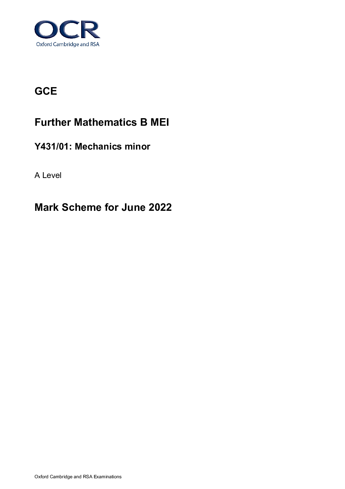 Mathematics > A-Level Mark Scheme > OCR A LEVEL 2022 FURTHER MATHS B MEI MARK SCHEME MECHANICS MINOR (All)