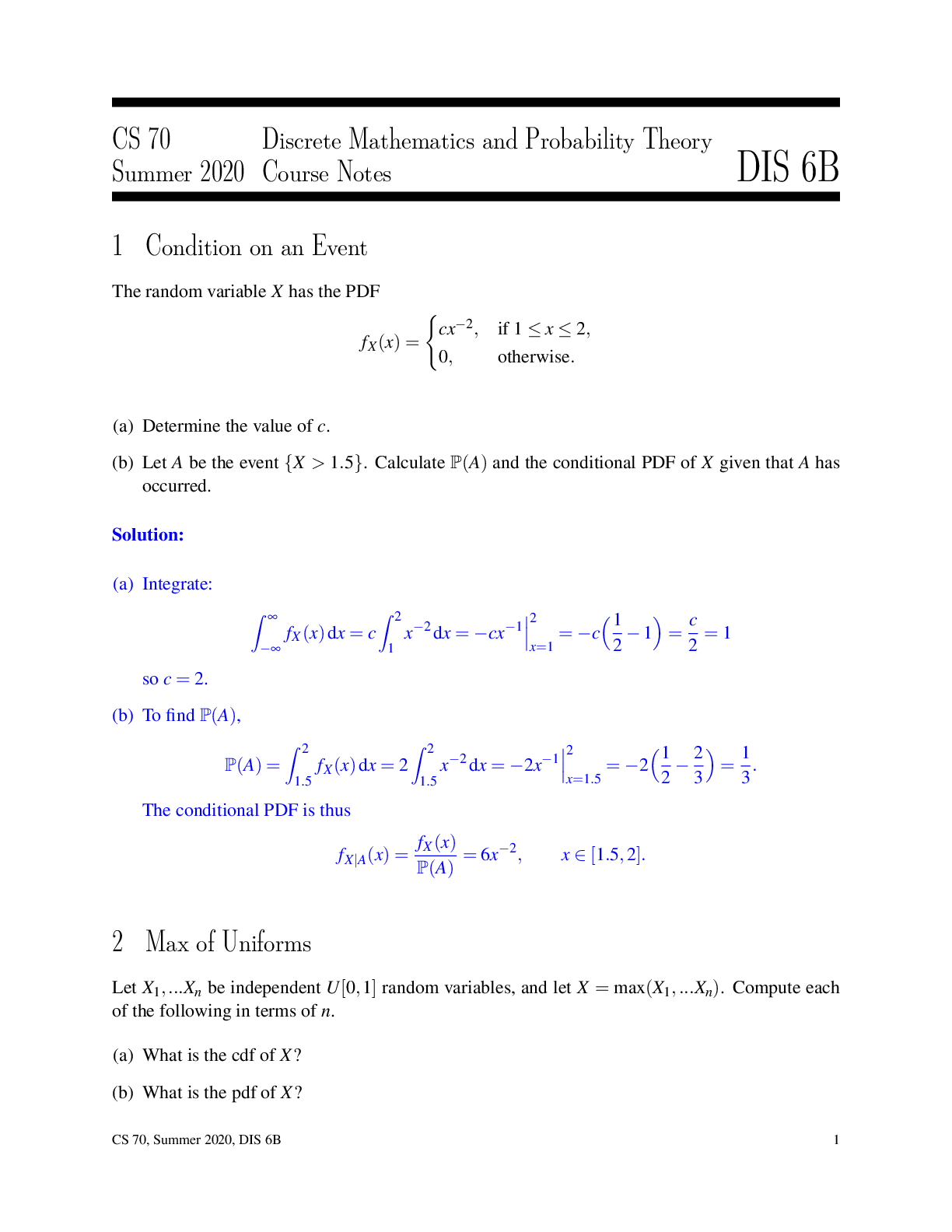 Mathematics > QUESTIONS & ANSWERS > University of California, Berkeley - CS 70 CS 70 Discrete Mathematics and Probability Theory Summer 2020. With all Solutions Worked Out. (All)
