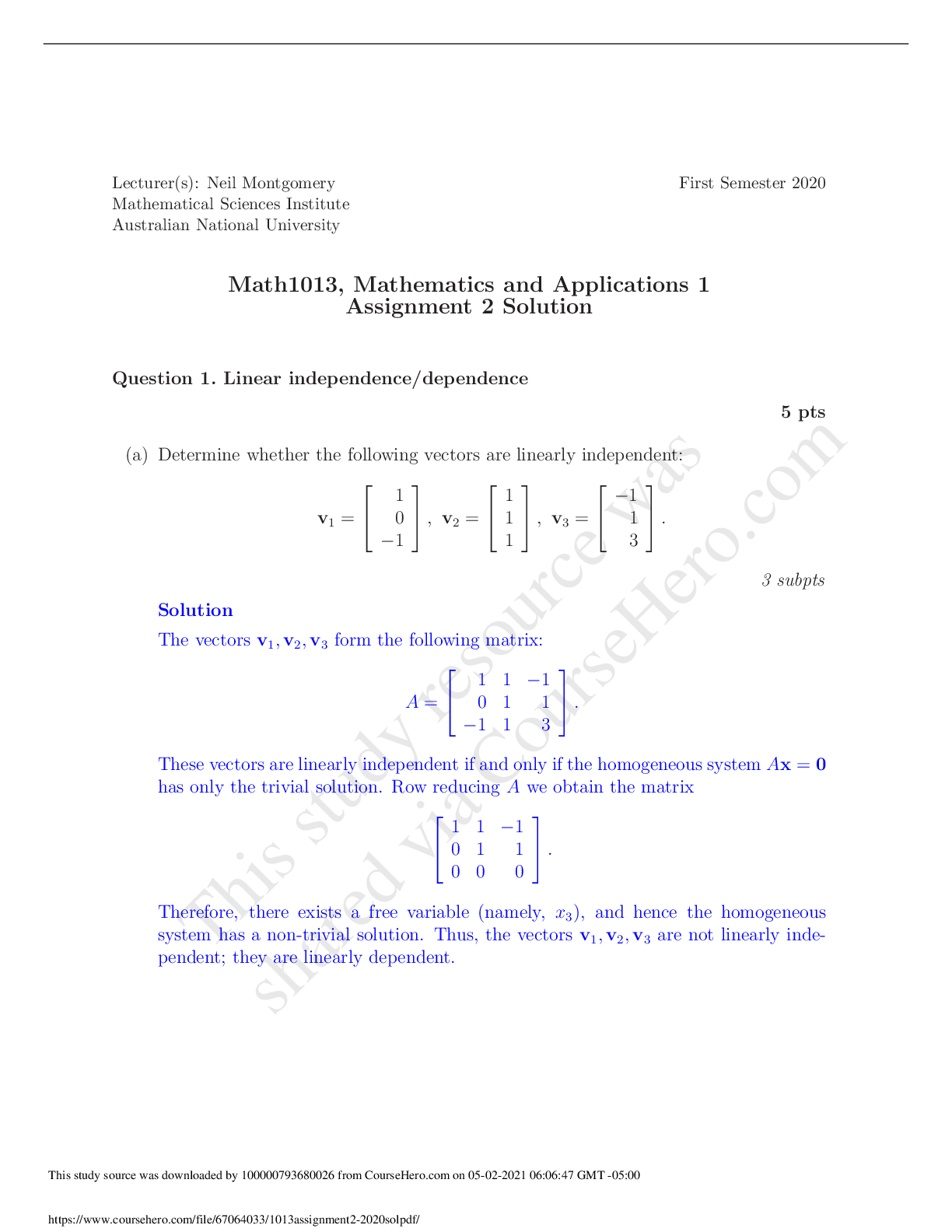 Mathematics > QUESTIONS & ANSWERS > Australian National UniversityMATH 10131013assignment2_2020. ALL ANSWERS CORRECT (All)