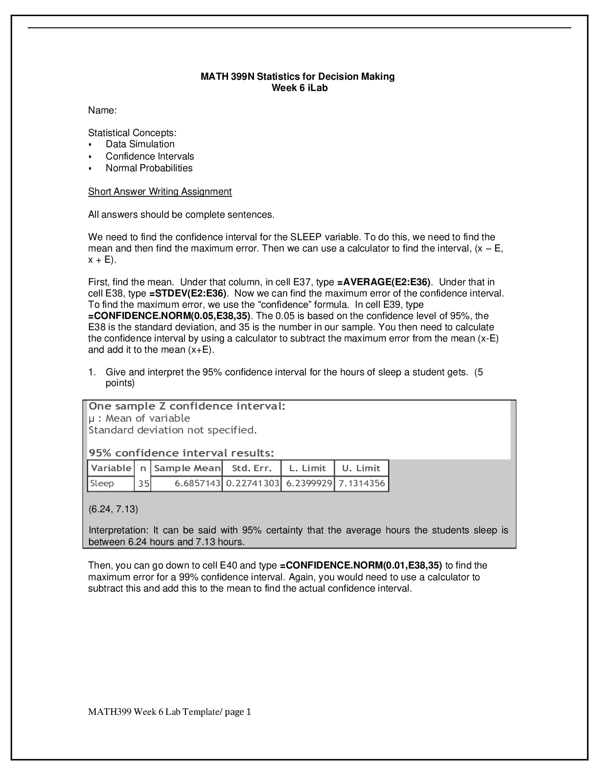 Mathematics > EXAM > MATH 399N WEEK 6 iLab / MATH399N WEEK 6 iLab (New 2021): STATISTICS FOR DECISION MAKING: CHAMBERLAIN COLLEGE OF NURSING (All)