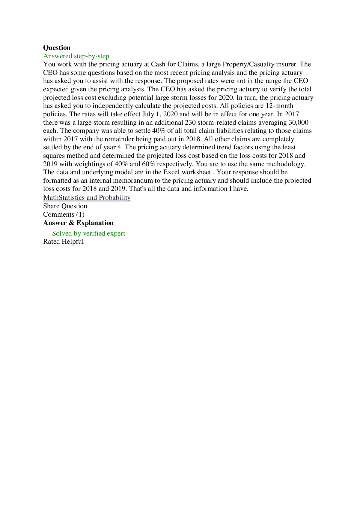 Mathematics > QUESTIONS & ANSWERS > Math Statistics and Probability You work with the pricing actuary at Cash for Claims, a large Property/Casualty insurer. The CEO has some questions based on the most recent pricing... (All)