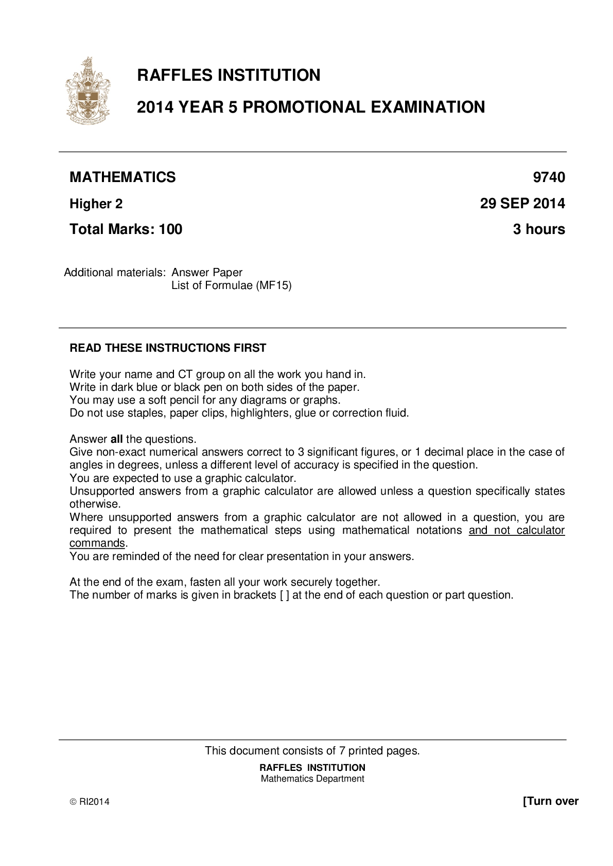 Mathematics > EXAM > RAFFLES INSTITUTION 2014 YEAR 5 PROMOTIONAL EXAMINATION ( With Mark Scheme) (All)