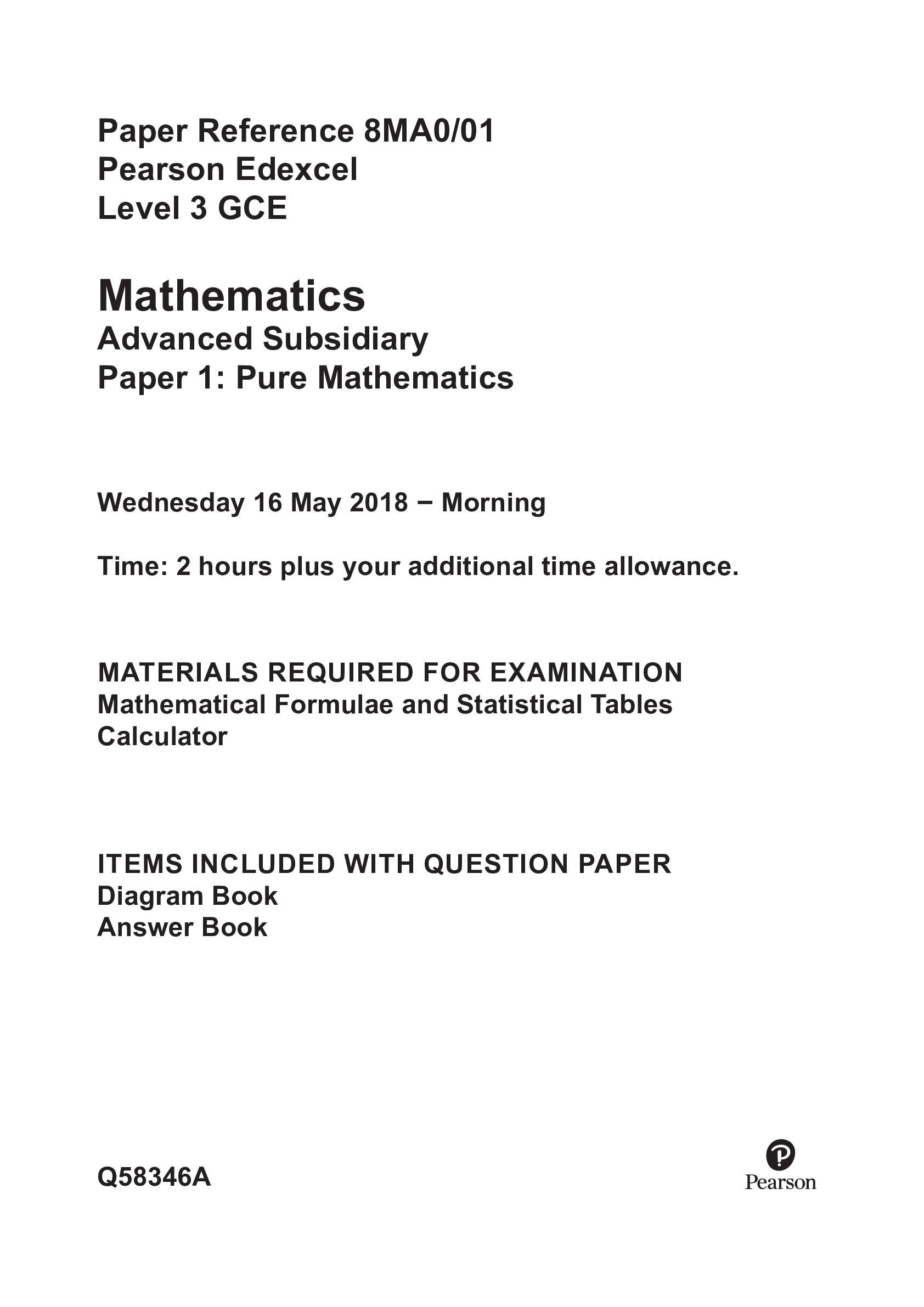Mathematics > Edexcel Question Paper > Paper Reference 8MA0/01 Pearson Edexcel Level 3 GCE Mathematics Advanced Subsidiary Paper 1: Pure Mathematics (All)