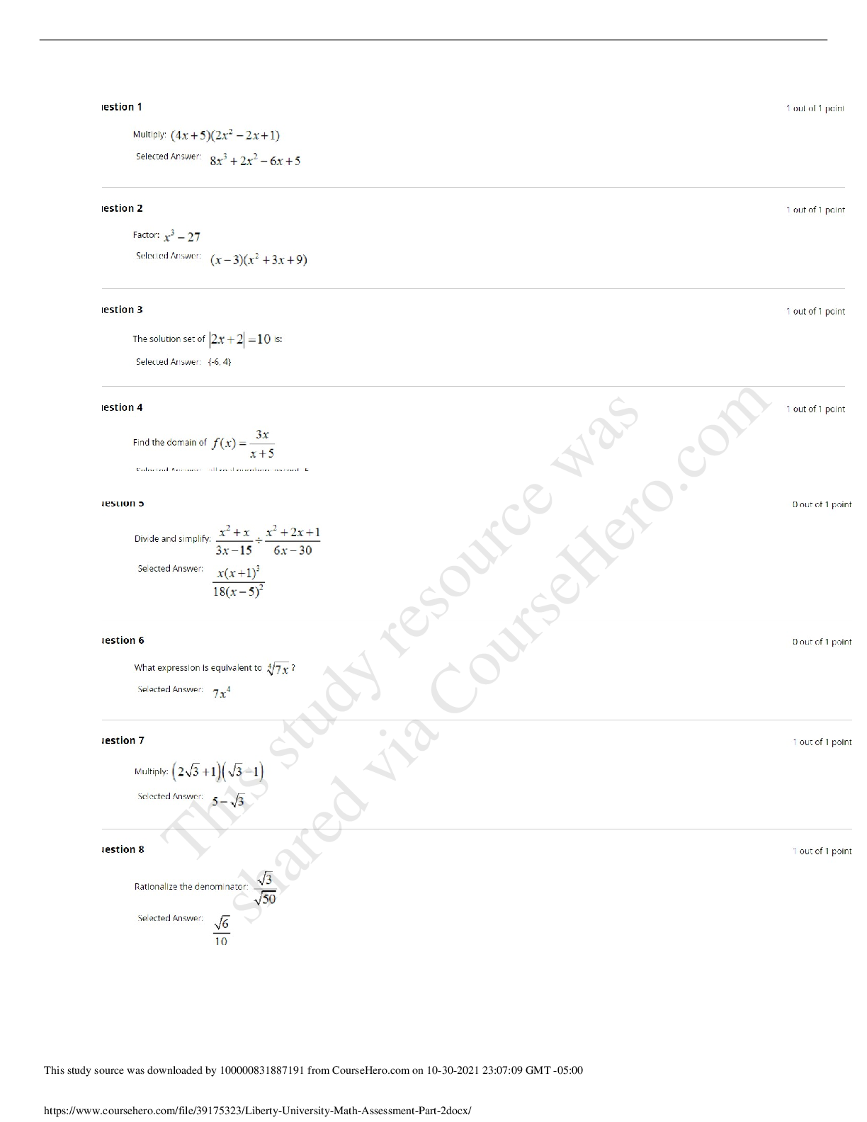 Mathematics > EXAM > LIBERTY UNIVERSITY MATH ASSESSMENT PART 1 & PART 2 COMPLETE SOLUTIONS (CORRECT ANSWERS KEY) (All)