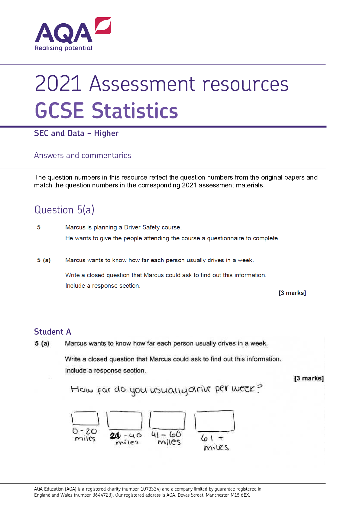 Mathematics > ANSWERS AND COMMENTARIES > AQA GCSE 8382 Statistics SEC and Data - Common Answers and Commentaries. 2021 Assessment resources (All)
