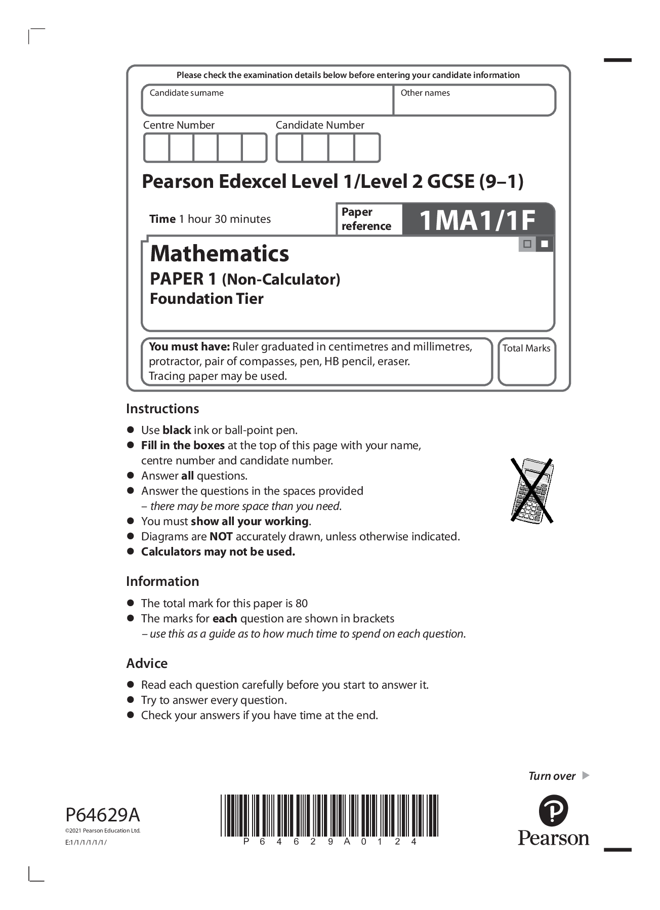 Mathematics > GCSE QUESTION PAPER > Pearson Edexcel Level 1/Level 2 GCSE (9–1) Mathematics PAPER 1 (Non-Calculator) Foundation Tier. 1MA1/1F. QUESTION PAPER. November 2021. (All)