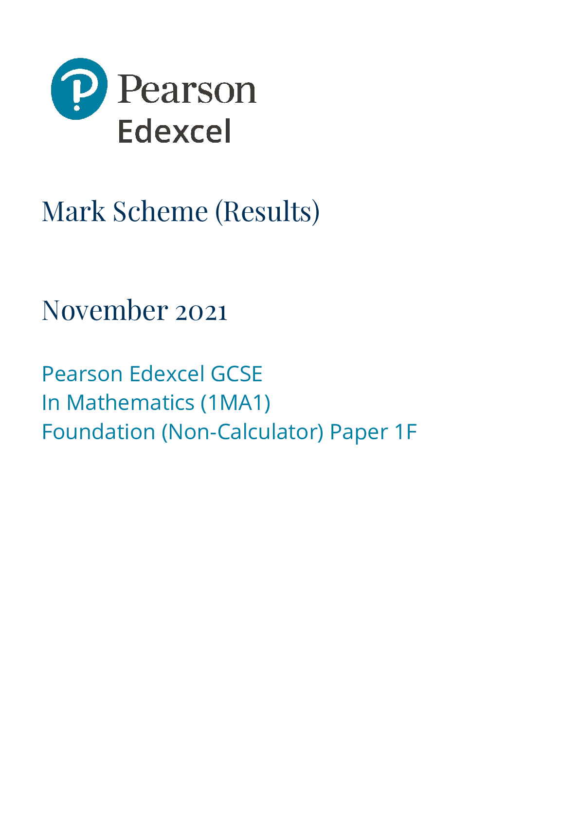 Mathematics > MARK SCHEMES > Pearson Edexcel GCSE In Mathematics (1MA1) Foundation (Non-Calculator) Paper 1F MARK SCHEME November 2021 (All)