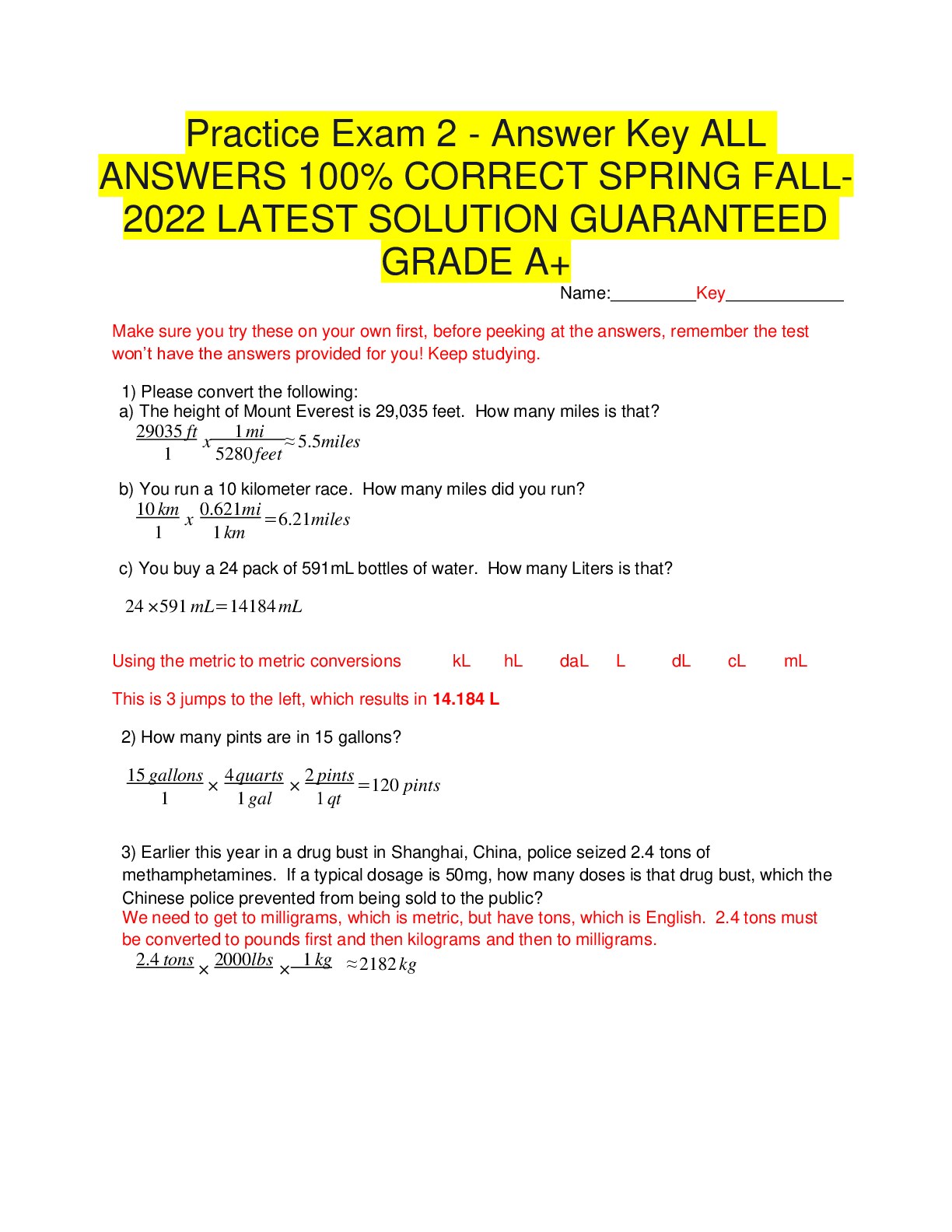 Mathematics > EXAM > Practice Exam 2 - Answer Key ALL ANSWERS 100% CORRECT SPRING FALL-2022 LATEST SOLUTION GUARANTEED GRADE A+ (All)