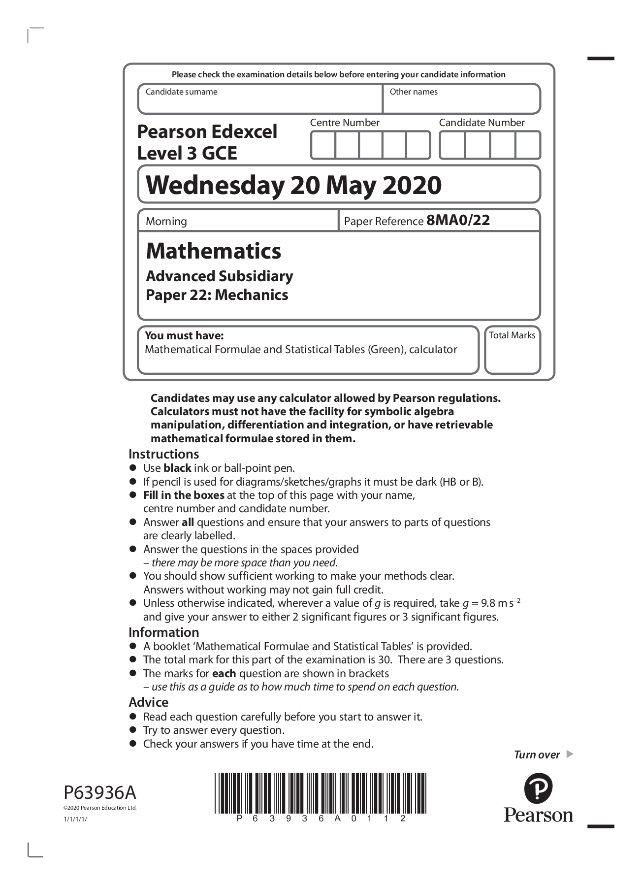 Mathematics > Edexcel Question Paper > Pearson Edexcel_Further Mathematics_8MA0/22 Question Paper_2020 | Paper 22: Mechanics (All)