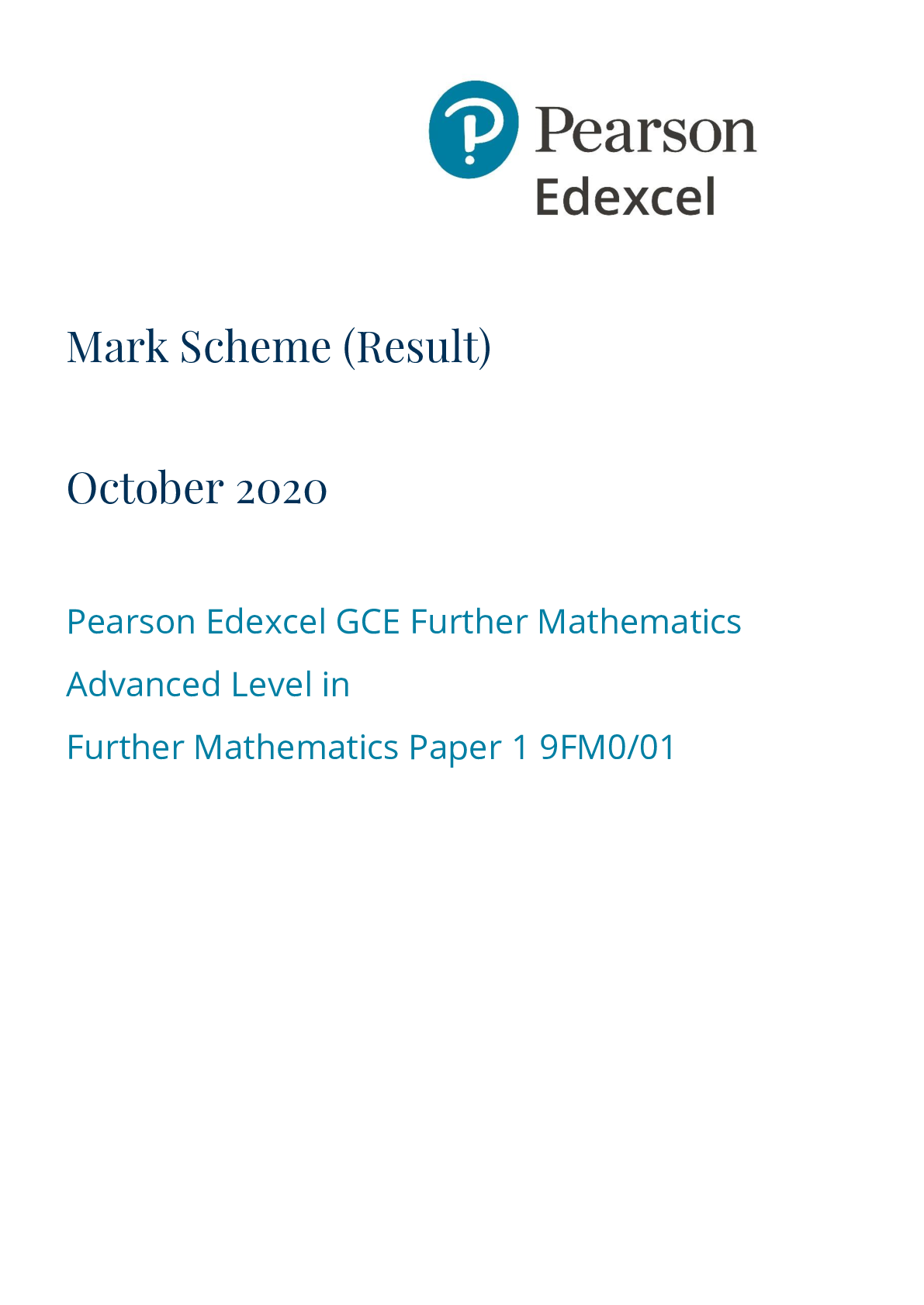Mathematics > Edexcel > Pearson Edexcel_Further Mathematics_9FM0/01 Mark Scheme_2020 | Paper 1: Core Pure Mathematics 1 (All)